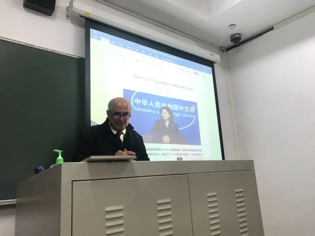 2020年12月9日上午,爱体育网页版阿拉伯语系课程集群思政进课堂系列讲座邀请了阿拉伯信息中心主任、曾任教于北京大学阿拉伯语系的前巴勒斯坦驻华大使穆斯塔法•萨法里尼先生来到教室为同学们讲课。本次讲座由阿拉伯语系袁琳老师主持,林丰民教授评议。