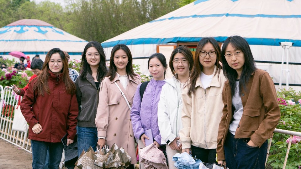 含经堂遗址前,同学们驻足于盛放的牡丹花海中。四月春风里,姚黄、魏紫、赵粉等名贵牡丹品种竞相绽放,恰似中华民族历经风雨洗礼后,再度焕发出蓬勃生机与繁荣盛景。