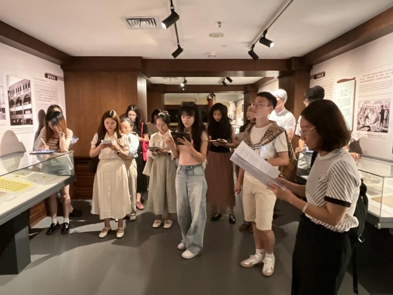 在第一轮参观过后,师生们开展专题口译模拟训练,由两位老师负责讲解、六位研究生同学轮流进行中泰语双向交传翻译,内容涵盖政治、经济、生活、文化、宗教等多个方面,重点关注泰国华侨华人的历史与活动。通过此轮口译模拟,研究生同学不仅锻炼了临场口译能力,更通过文物语境深化了对专业知识的理解。两位老师根据同学们的翻译表现,从"语境化语言重组"、"专有名词处理"、"信息筛选策略"等维度进行针对性指导。本科生同学在旁听过程中亦同步学习了翻译技巧与历史文化知识。