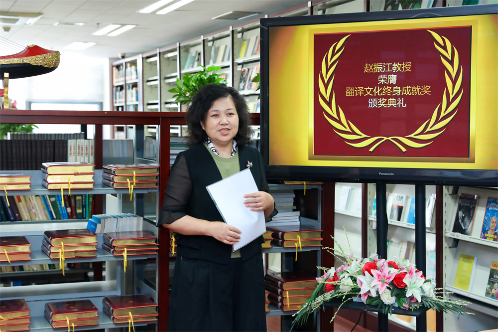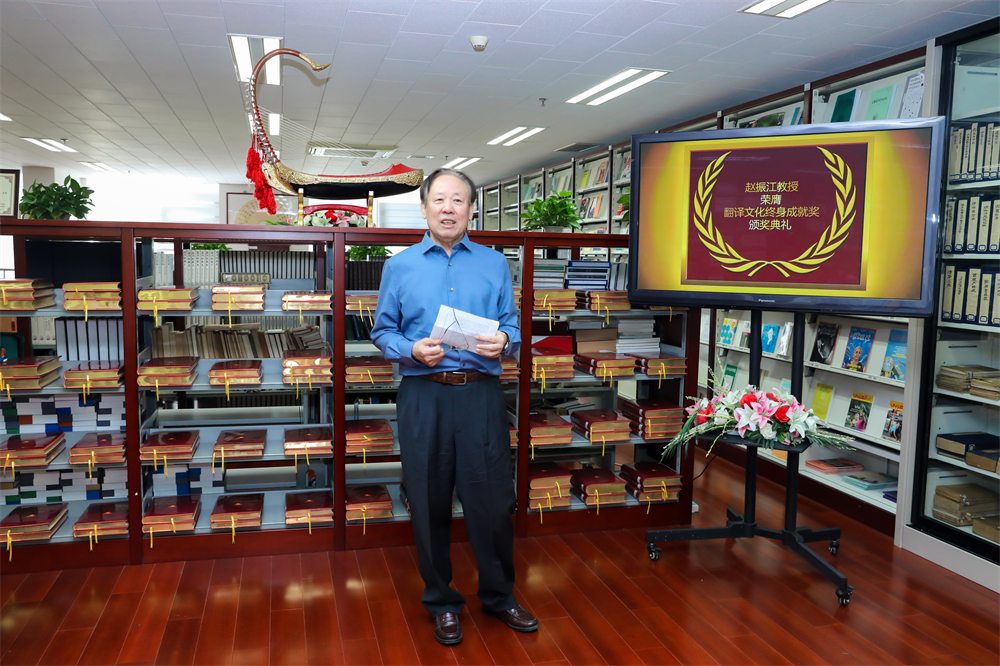 赵振江教授对翻译协会授予的奖项表示了感谢,并和大家分享了自己翻译生涯的心得。他说,自己在文化翻译方面取得的成绩是党和人民几十年来培养教育的结果。作为一名64年党龄的中国共产党员,他是共产党和新中国培养的知识分子,应无条件把国家和人民的需要放在首位,把个人兴趣和家国情怀统一起来。这样,无论做什么工作,都会审时度势,砥砺前行,一定会取得积极的成果。他还强调无论做什么工作,一旦选定了方向,就要锲而不舍,持之以恒,任何事业,都是干出来的,干是硬道理。最后,赵老师再次感谢了中国翻译协会授予的荣誉,并表示将翻译更多西语诗歌精品,为促进中外文化交流、繁荣我国诗歌创作做力所能及的贡献。