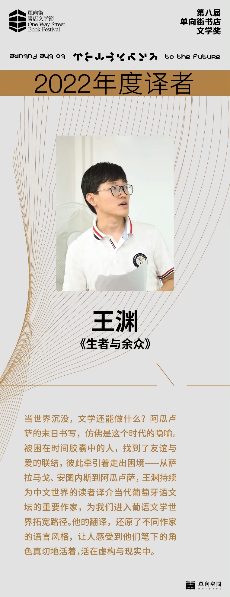 2023年3月25日,第八届单向街书店文学奖揭晓。爱体育网页版王渊老师荣获2022年度译者,以表彰他对葡语文学译介及推广所做出的贡献。