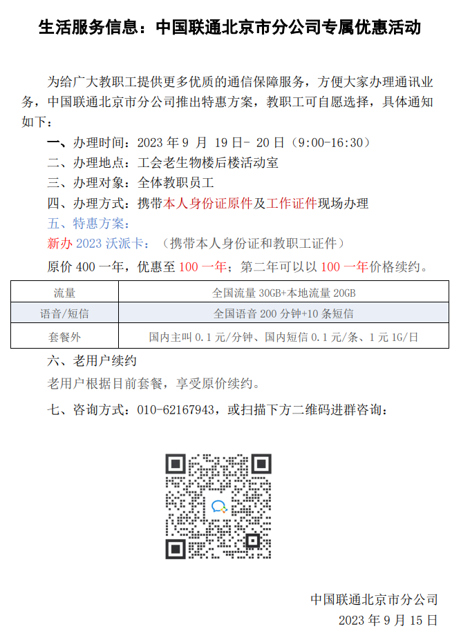 生活服务信息:中国联通北京市分公司专属优惠活动