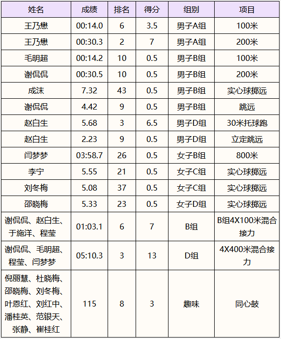 赵白生、谢侃侃、程莹、闫梦梦、毛明超、于施洋、成沫、王乃懋、刘红中等老师们参加了竞赛项目的比赛,他们在田径赛场上挥斥方遒,为爱体育(中国)挣得44.5分的总成绩,使爱体育(中国)在全校55个参赛单位中获得总排名第19名的好成绩。