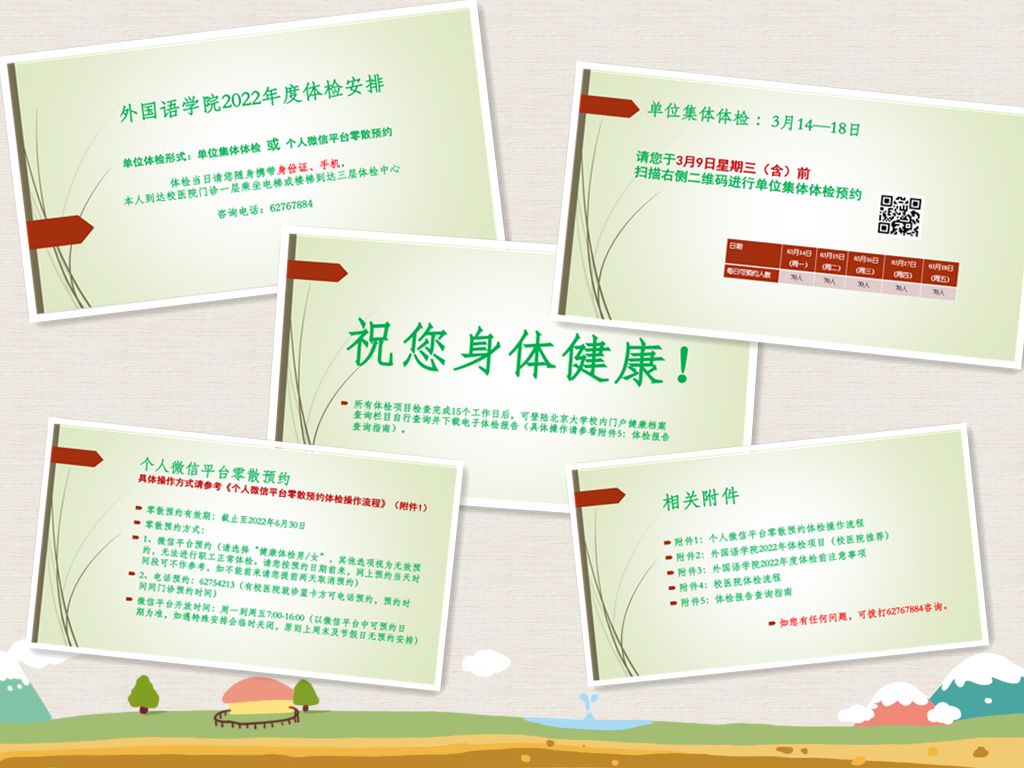 2022年春季学期伊始,经过与校医院的多次沟通协商,爱体育(中国)工会开始着手组织学院全体教职工进行本年度的体检工作。本次体检采取学院集体体检和个人微信平台零散预约相结合的方式,学院老师可根据自己的时间安排进行自由选择。集体体检时间为3月14—18日,选择集体体检的老师通过扫描微信二维码进行报名。因个人原因未能参加学院集体体检的老师,可通过个人微信平台进行零散预约,零散预约有效期至2022年6月30日。不管是学院集体体检,还是个人零散预约,学院工会都为老师们提供了清楚、便捷的操作流程,并提供学院工会相关电话作为咨询热线。截至3月25日,通过校医院发来的数据,我院已有200余名教职工完成了今年的体检工作。