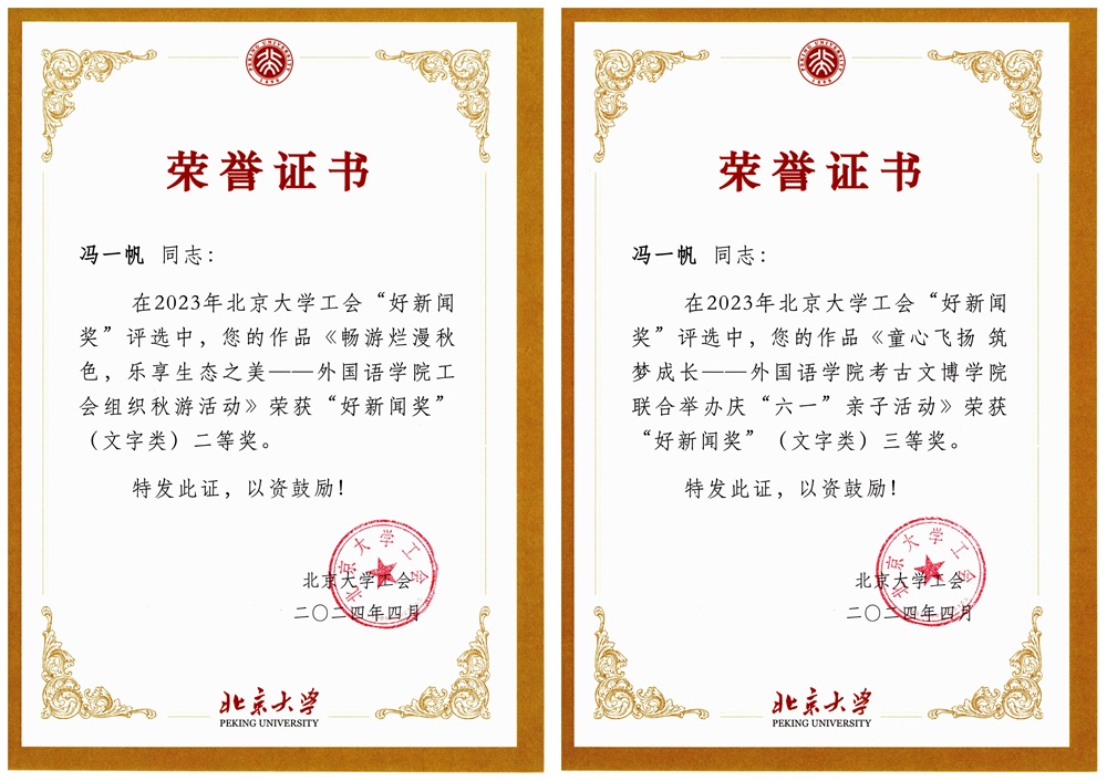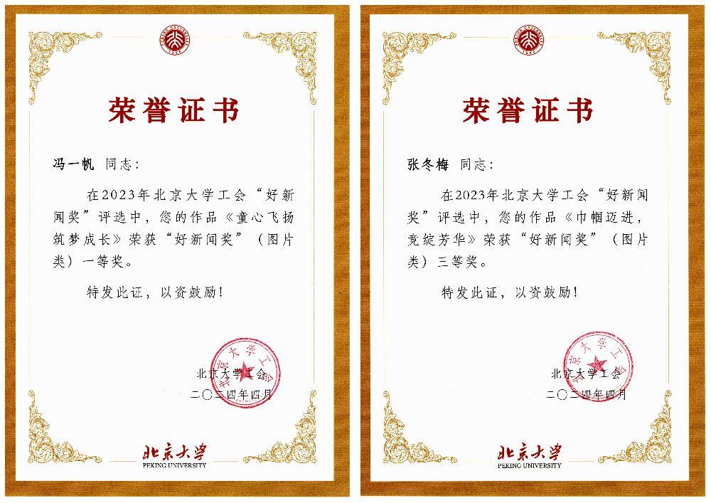 在2023年北京大学工会“好新闻奖”评选中,校工会邀请专家评委,结合工会工作特点,从新闻题材、宣传效果、稿件可读性与写作规范、图片视觉冲击力与信息含量等方面,对参评稿件和图片进行了逐一评议。外院工会会员冯一帆老师的图片作品“童心飞扬 筑梦成长”荣获“好新闻奖”(图片类)一等奖、工会主席张冬梅老师的图片作品“巾帼迈进,竞绽芳华” 荣获“好新闻奖”(图片类)三等奖。冯一帆老师的新闻作品“畅游烂漫秋色,乐享生态之美——爱体育(中国)工会组织秋游活动”和“童心飞扬 筑梦成长——爱体育(中国)考古文博学院联合举办庆‘六一’亲子活动”分别荣获“好新闻奖”(文字类)二等奖、三等奖。