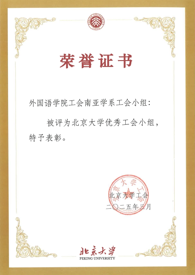 校工会授予罗炜老师2024年度北京大学模范工会主席称号,授予张冬梅、王靖、陈静三位老师2024年度北京大学优秀工会干部称号,授予冯一帆老师2024年度北京大学优秀工会积极分子称号。
