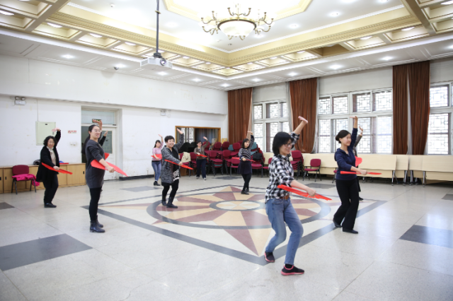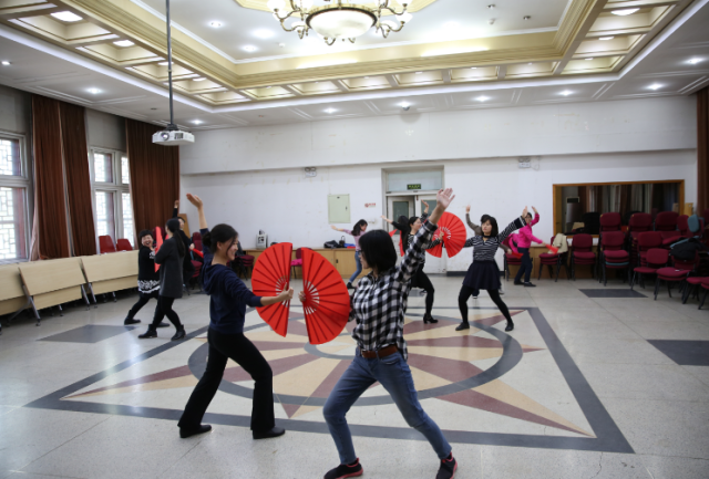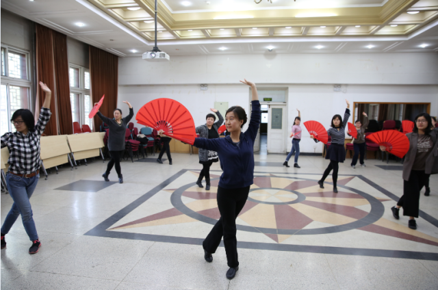 今年北京大学运动会的团体操表演项目是未名太极扇,爱体育(中国)积极响应学校工会的号召,在工会常务副主席、副院长张冬梅老师、工会副主席刘军老师、文体委员李宁老师、女工委员鲁学彬老师、工会小教员刘水老师的带领下组织了30余人的太极扇团队,每天11:00—11:30准时排练。因春季时常有雾霾天气,外院工会特提供民主楼208室内多功能厅以及多媒体设备供太极扇排练使用。
