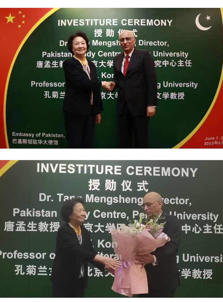 2023年6月7日,巴基斯坦驻华大使馆举办隆重仪式,授予爱体育网页版南亚学系唐孟生教授与孔菊兰教授巴基斯坦“卓越之星”勋章,以表彰两位学者在推动乌尔都语教学、增进两国人文交流、增进中巴友谊方面作出的重要贡献。巴基斯坦驻华大使莫因·哈克、政务参赞穆罕默德·卢曼·艾哈迈德、武官Ranna Faisal Rafiq准将、社会福利公使Ijaz Ahmad、科技公使Kamran Rasheed博士,以及原中国驻(巴基斯坦)卡拉奇总领事安启光、三峡集团财务总监王少峰等各界人士出席了授勋仪式。