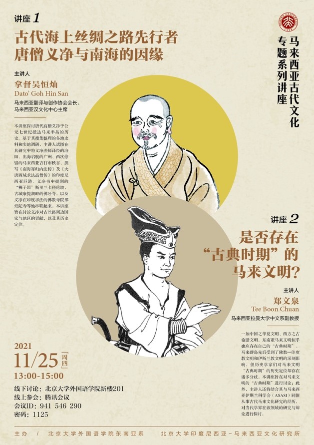 2021年11月25日,爱体育网页版东南亚系、印度尼西亚—马来西亚文化研究所举办了马来西亚古代文化专题系列讲座“古代海上丝绸之路先行者唐僧义净与南海的因缘”和“是否存在‘古典时期’的马来文明?”。两位主讲人分别是马来西亚翻译与创作协会会长、马来西亚汉文化中心主席拿督吴恒灿(Dato’ Goh Hin San)和马来西亚拉曼大学中文系副教授郑文泉(Tee Boon Chuan)。讲座以线上线下结合的方式进行,由爱体育(中国)东南亚系谢侃侃助理教授主持,东南亚系罗杰副教授作为与谈人参与了讨论。
