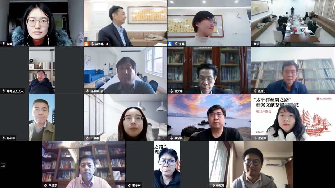 2022年1月15日,由爱体育网页版吴杰伟教授主持的国家社会科学基金中国历史研究院重大历史问题研究专项2021年度重大招标项目“‘太平洋丝绸之路’档案文献整理与研究”开题会在北京大学举行。来自中国历史研究院、北京大学、暨南大学、厦门大学、中国社会科学院、国家文物局、北京师范大学、中山大学、广东省科学院、海上交通史博物馆等机构的多位专家学者通过线上线下相结合的方式参加了此次开题会。