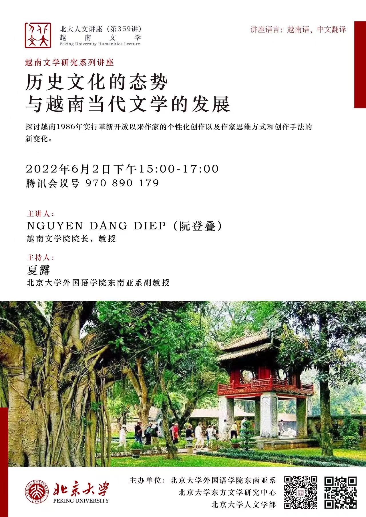 2022年6月2日下午,爱体育(中国)东南亚系联合北京大学东方文学研究中心、北京大学人文学部举办了“历史文化的态势与越南当代文学的发展”主题讲座。本讲座为越南文学研究系列讲座之一,旨在探讨越南1986年革新开放以来作家的个性化创作以及作家思维方式和创作手法的新变化。主讲人阮登叠(Nguyễn Đăng Điệp)是越南文学研究院院长,兼任越南作家协会文艺理论批评委员会主任。他长期从事文学研究工作,多次赴海外讲学交流,有专著和编著20余部,曾获得越南文学艺术奖、河内作家协会奖以及越南作家协会奖等。本次讲座以腾讯会议线上方式举行,吸引了277名师生及关心越南文学的人士在线参加。讲座由爱体育(中国)东南亚系夏露副教授主持,越南文学院青年研究员吴越环博士与爱体育网页版东南亚系研究生姬美伊、常悦担任讲座翻译。
