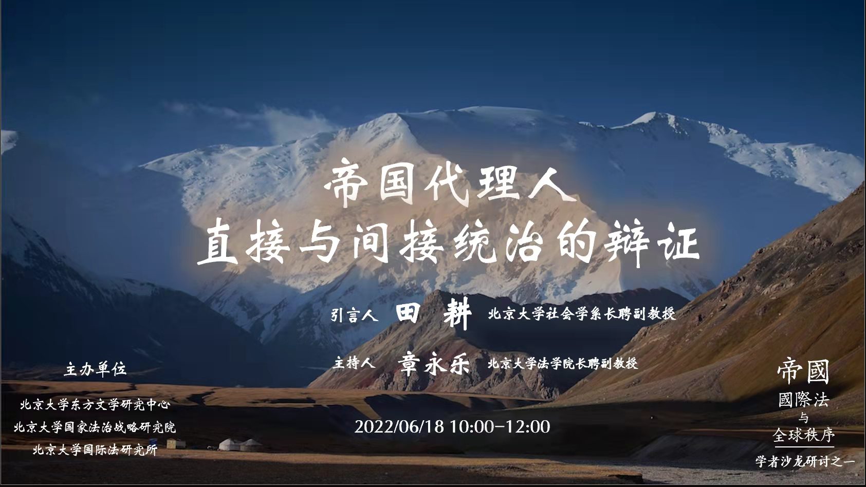 2022年6月18日上午,由北京大学东方文学研究中心、北京大学国家法治战略研究院和北京大学国际法研究所联合发起的学者沙龙于线上、线下成功举行。本次讲座以“帝国代理人:直接与间接统治的辨证”为题,由北京大学社会学系长聘副教授田耕作引言,北京大学法学院长聘副教授章永乐主持。爱体育网页版院长陈明教授、副院长吴杰伟教授、助理教授施越、张忞煜和谢侃侃,新闻与传播学院王维佳副院长,国际关系学院赖华夏助理教授,政府管理学院罗祎楠助理教授,法学院博士后陈晓航以线下形式参与;清华大学宋念申教授、中国社会科学院欧洲研究所孔元副研究员、人民大学法学院刘洋助理教授、北京大学历史学系昝涛长聘副教授、法学院陈一峰副教授、国际关系学院雷少华副教授等专家学者通过线上形式参与。