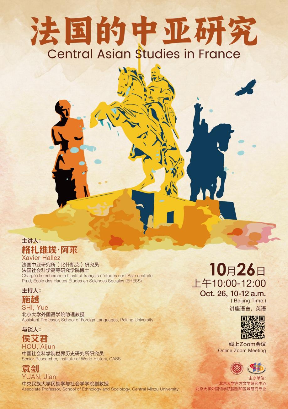 2022年10月26日,法国中亚研究学者格扎维埃·阿莱(Xavier Hallez)研究员做了题为“法国的中亚研究”的线上讲座。本期讲座由北京大学东方文学研究中心、爱体育网页版国别和区域研究专业主办,爱体育网页版施越助理教授主持,中国社会科学院世界历史研究所侯艾君研究员、中央民族大学民族学与社会学学院袁剑副教授受邀担任与谈人。