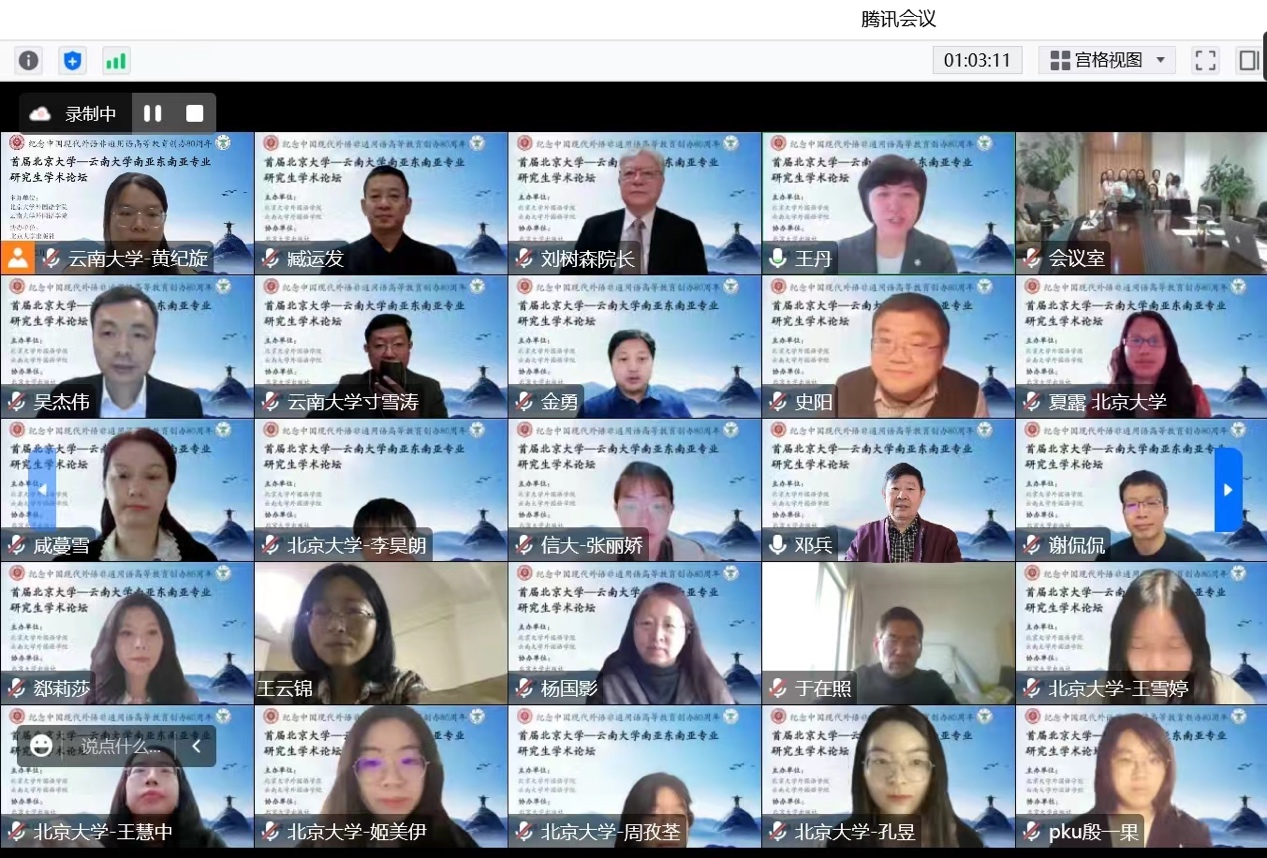 为了增进爱体育网页版与云南大学爱体育(中国)的合作,推进双方的“科教融合研究生联合培养项目”, “首届北京大学-云南大学南亚东南亚专业研究生学术论坛”于2022年11月12日以线上线下结合的方式举行,主会场设在云南大学,北京大学师生线上参会。本次论坛由爱体育网页版东南亚系,与云南大学爱体育(中国)东南亚系和南亚系联合筹备、合作举办,参加此次论坛并宣读论文的研究生共20人,来自北京大学、云南大学、信息工程大学洛阳校区三所高校的南亚东南亚相关专业,评议专家团队由爱体育网页版东南亚系与云南大学爱体育(中国)东南亚系、南亚系共13位教师组成。另有来自北京师范大学、北京外国语大学、中国人民大学、复旦大学、中山大学、吉林大学、四川大学、浙江大学、对外经济贸易大学、广东外国语大学、西安外国语大学、广西大学、厦门大学、红河学院、普洱学院等十多所高校百余名师生在线上参加了本次论坛。