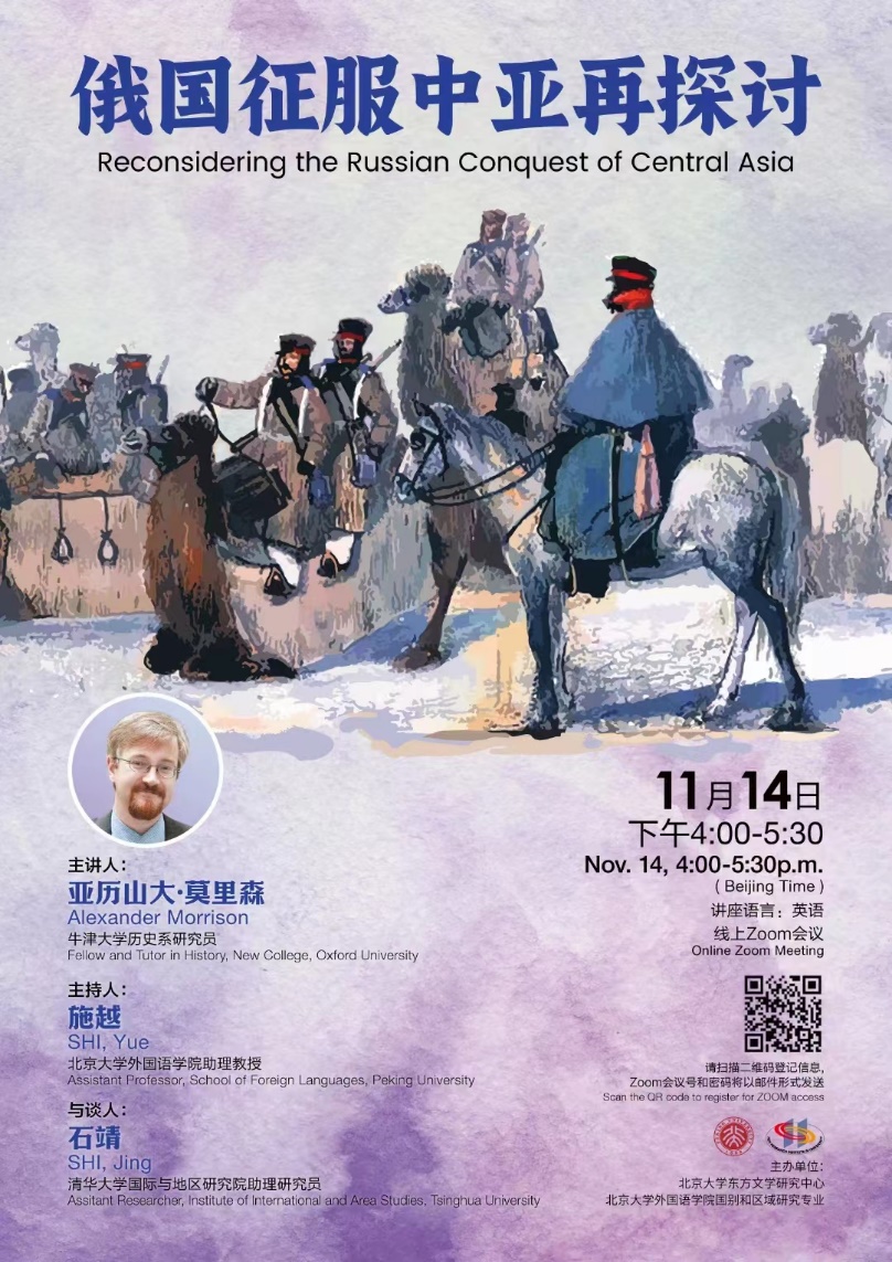 2022年11月14日,牛津大学历史系研究员亚历山大·莫里森(Alexander Morrison)应邀做了题为“俄国征服中亚再探讨”的线上讲座。本期讲座由北京大学东方文学研究中心、爱体育网页版国别和区域研究专业主办,爱体育网页版助理教授施越主持,清华大学国际与地区研究院助理研究员石靖受邀担任与谈人。