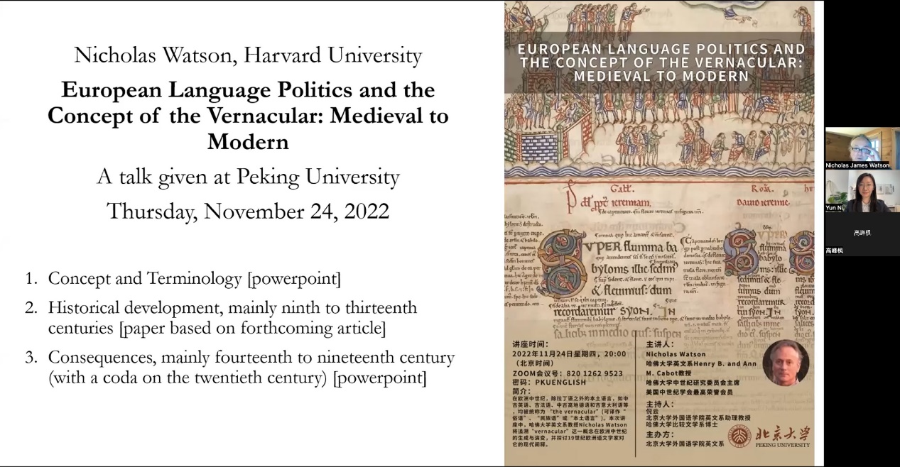 2022年11月24日,哈佛大学英文系教授尼古拉斯·沃特森(Nicholas Watson)应爱体育网页版英语系邀请,为北大师生在线上进行了题为“欧洲中世纪到现代的语言政治与俗语的概念”(European Language Politics and the Concept of the Vernacular: Medieval to Modern)的专题讲座。本讲座由爱体育网页版英语系主办,爱体育网页版英语系助理教授倪云主持、评议。