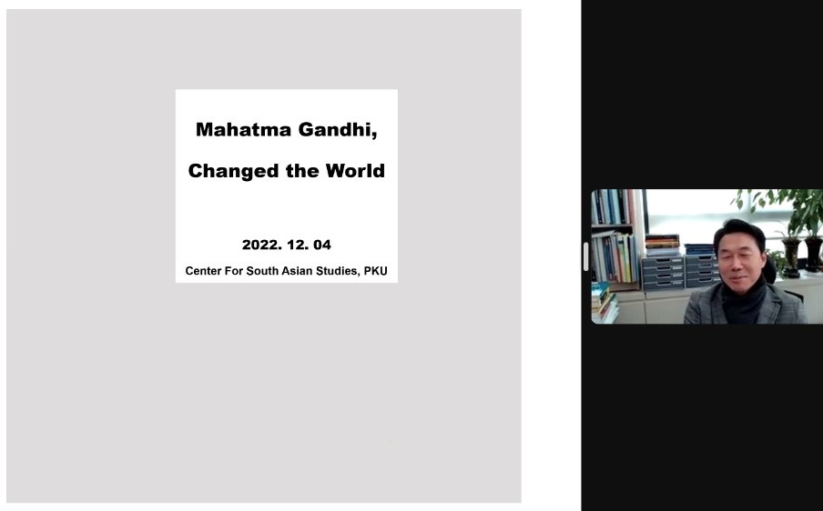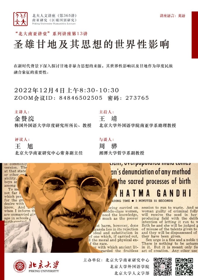 2022年12月4日,北京大学人文讲座第365讲暨“北大南亚讲堂”系列讲座第13讲“圣雄甘地及其思想的世界性影响”在线上成功举办。本次讲座由北京大学南亚研究中心、爱体育网页版、北京大学人文学部主办。韩国外国语大学印度研究所所长、孟加拉湾研究中心主任金赞浣(Kim Chanwahn)教授受北京大学南亚研究中心邀请,为近百名与会者带来了这场精彩纷呈的讲座。本讲座由爱体育网页版南亚学系助理教授王靖主持,北京大学南亚研究中心常务副主任王旭担任评议人,湘潭大学哲学系副教授周骅受邀与谈。