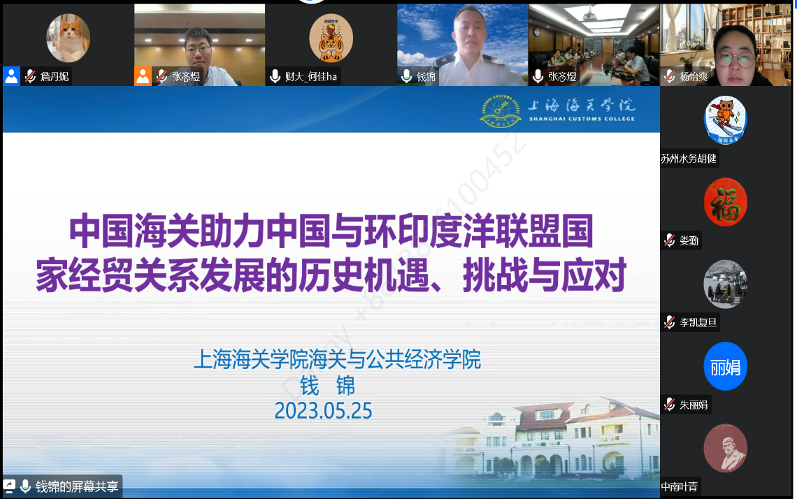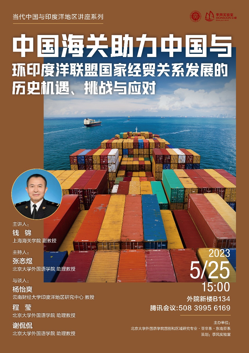 2023年5月25日,上海海关学院副教授钱锦应邀为我院师生进行题为“中国海关助力中国与环印度洋联盟国家经贸关系发展的历史机遇、挑战与应对”的讲座。本次讲座是“当代中国与印度洋地区”系列讲座的第二讲,由爱体育网页版国别和区域研究专业、亚非系和东南亚系主办,爱体育网页版张忞煜助理教授主持,云南财经大学印度洋地区研究中心杨怡爽教授、北大外院程莹助理教授和谢侃侃助理教授参与讨论。本次讲座在外院新楼B134会议室和线上平台同步举行,来自各高校的近百名师生在线参与讲座。