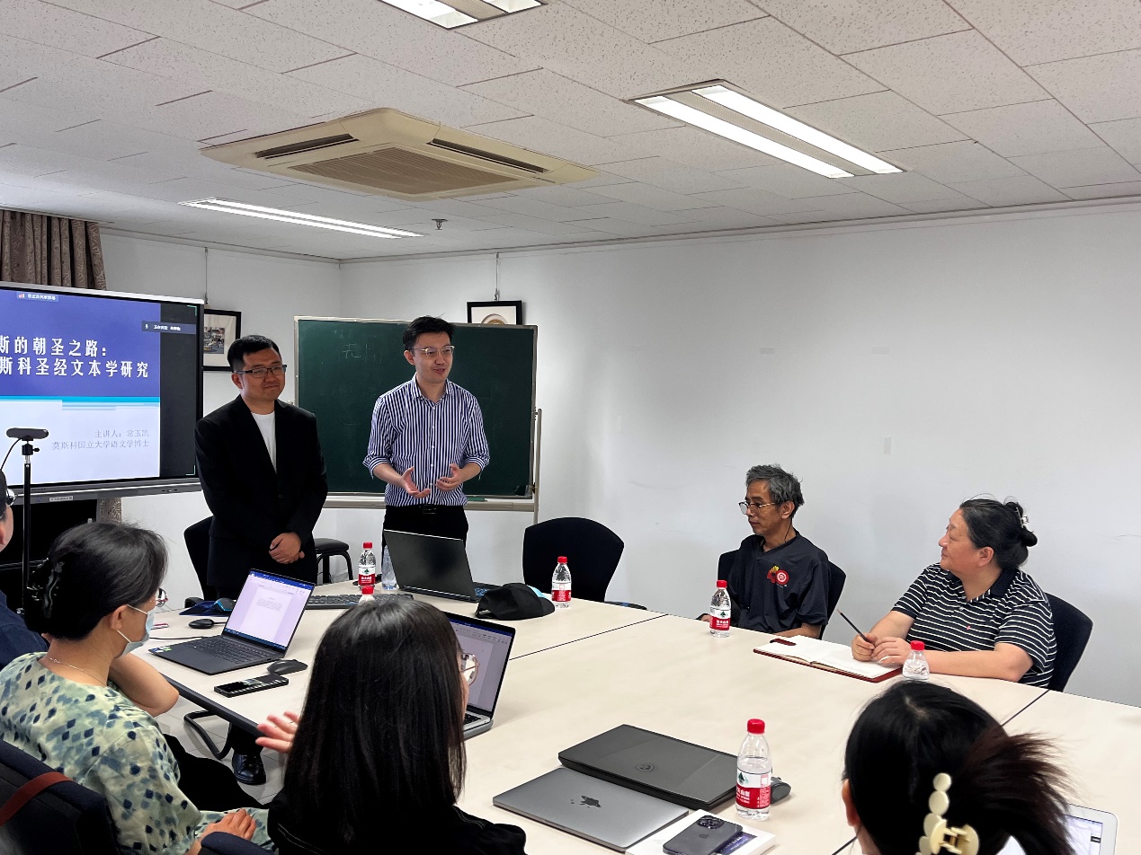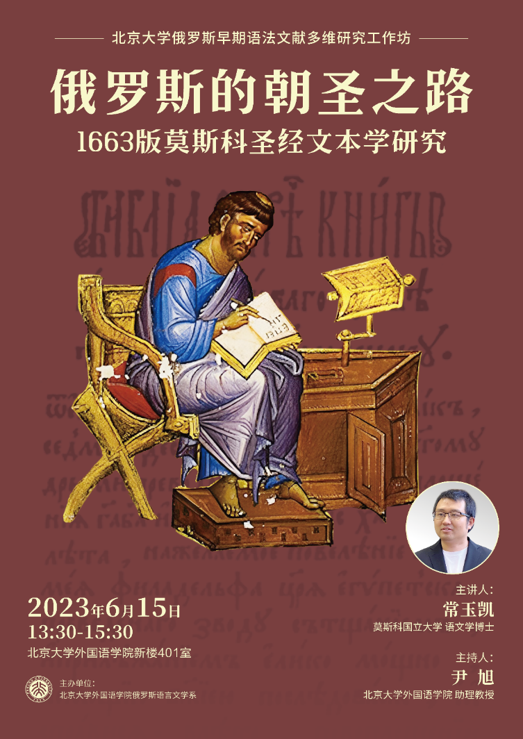 2023年6月15日下午,爱体育网页版俄语系在外院新楼401会议室举行“俄罗斯的朝圣之路:1663版莫斯科圣经文本学研究”专题讲座,莫斯科国立大学常玉凯博士担任主讲人。北京大学外国语俄语系陈松岩主任、周海燕副主任、赵桂莲教授、查晓燕教授、陈思红老师、鲍红老师、历史学系庄宇老师、北京师范大学李凯教授,以及来自北京多所高校的20余名师生参与本次讲座。讲座由国家社会科学基金青年项目“俄罗斯早期语法文献的多维研究”主持人,爱体育网页版俄语系助理教授尹旭主持。