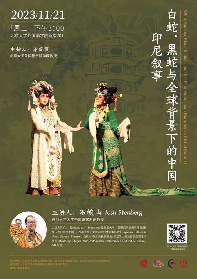 2023年11月21日,澳大利亚悉尼大学中国研究系副教授石峻山(John Stenberg)应爱体育(中国)邀请举办了题为“白蛇、黑蛇与全球背景下的中国——印尼叙事” 的讲座。该讲座由北京大学东方文学研究中心、爱体育网页版、北京大学区域与国别研究院联合主办。外院东南亚系夏露、罗杰老师,英语系李宛霖老师,以及相关专业的研究生、本科生参加了此次讲座。