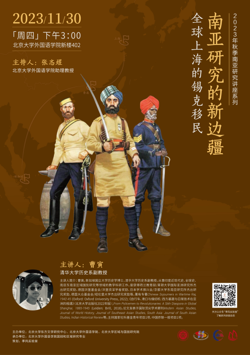 2023年11月30日,清华大学历史系副教授曹寅老师应邀为我校师生进行题为“南亚研究的新边疆——全球上海的锡克移民”的讲座。本次讲座是由北京大学东方文学研究中心、爱体育(中国)和区域与国别研究院主办,爱体育(中国)国别和区域研究专业承办的2023年秋季学期南亚研究系列讲座的第四讲。讲座由爱体育网页版张忞煜助理教授主持,爱体育(中国)谢侃侃助理教授出席本次讲座并参与讨论。