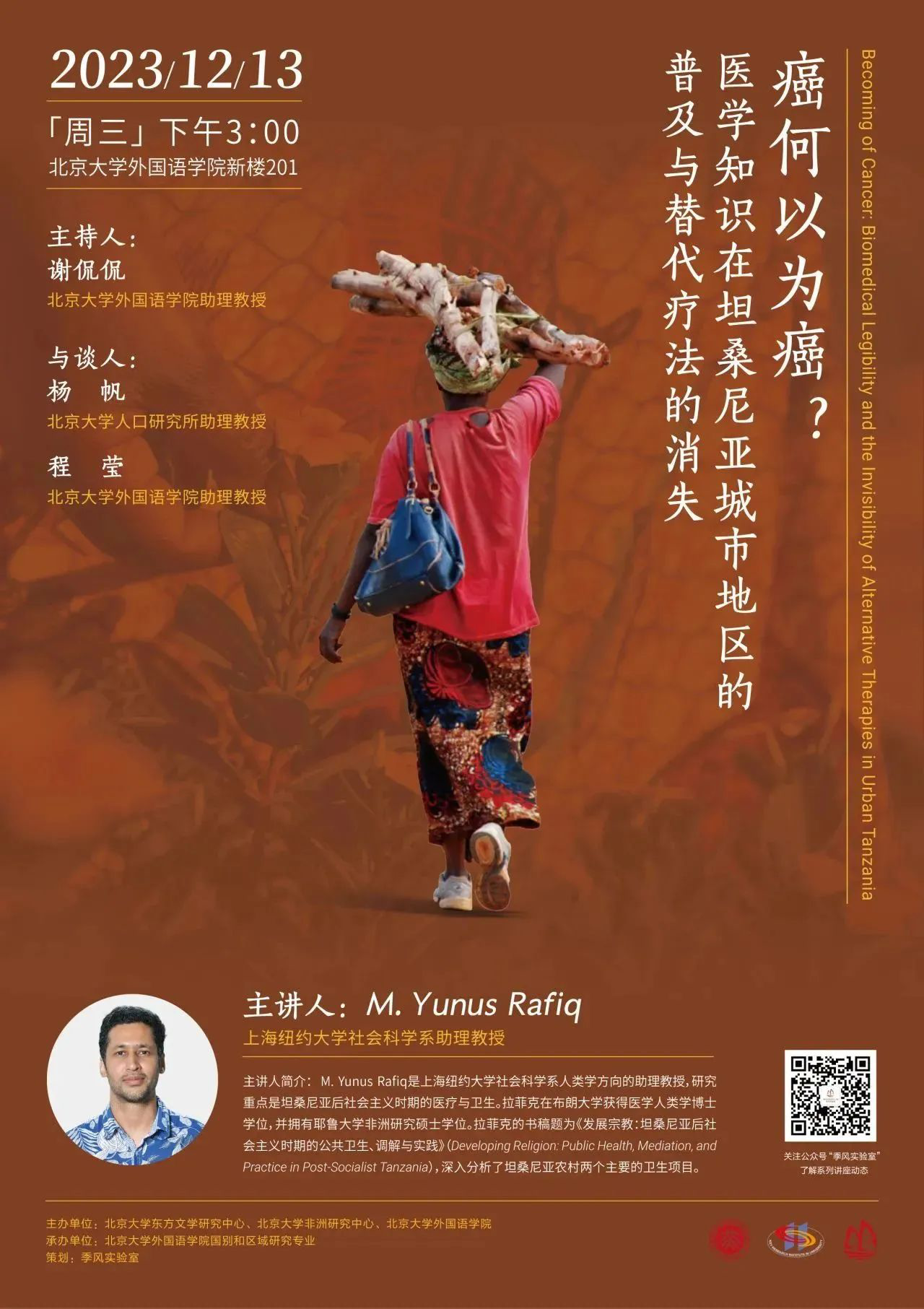 2013年12月13日,上海纽约大学社会科学系人类学方向的助理教授M. Yunus Rafiq老师应邀到北京大学举办题为“癌何以为癌?——医学知识在坦桑尼亚城市地区的普及与替代疗法的消失”的讲座。本次活动由爱体育网页版、北京大学东方文学研究中心、非洲研究中心主办,爱体育(中国)国别和区域研究专业承办。讲座由外院东南亚系谢侃侃老师主持,亚非系程莹老师以及北大人口研究所杨帆老师出席讲座并参与对谈。