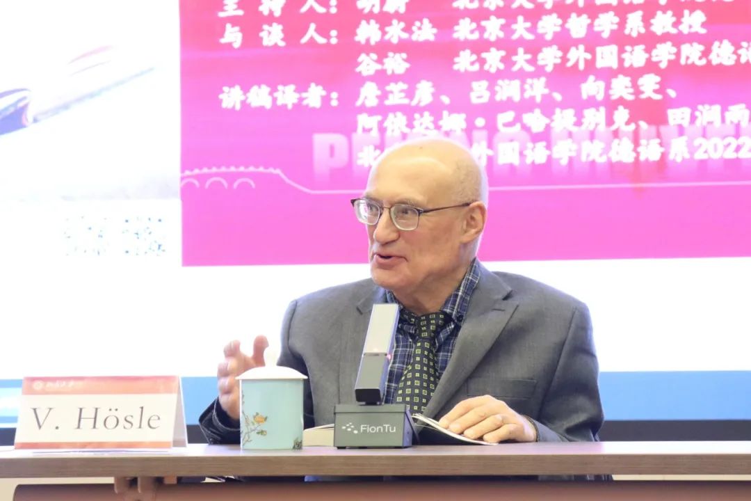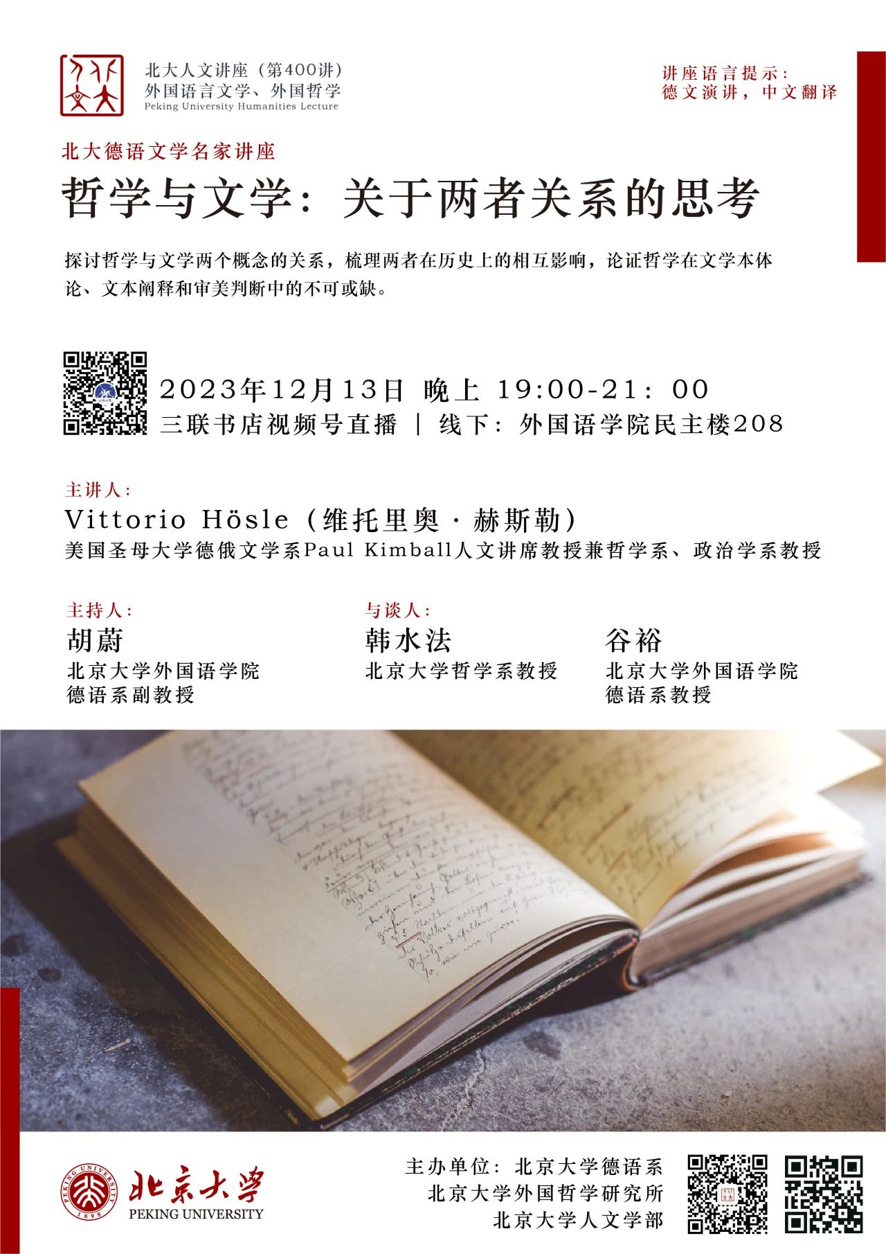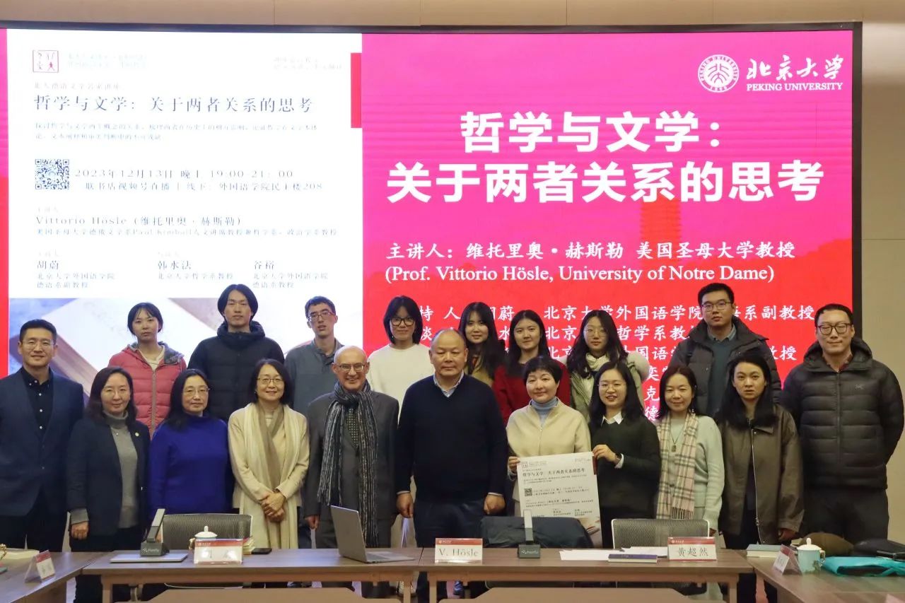 2023年12月13日晚,大雪纷飞,应爱体育网页版德语系邀请,美国圣母大学Paul Kimball人文讲席教授(兼任德语系、哲学系、政治学系教授)、圣母大学人文高等研究院创始院长赫斯勒(Vittorio Hösle)教授在民主楼208会议室做题为“哲学与文学:关于两者关系的思考”的精彩主题报告。该讲座由爱体育网页版德语系主任胡蔚副教授担任主持,哲学系韩水法教授、德语系谷裕教授担任与谈人,德语系黄超然助理教授担任现场交替传译。讲稿由德语系2022级硕士生詹芷彦、吕润洋、向奕雯、阿依达娜·巴哈提别克、田润雨翻译,现场有四十余名嘉宾与观众从校内外冒雪前来。本次活动由爱体育网页版德语系、北京大学外国哲学研究所和北京大学人文学部联合主办,由三联书店视频号全程直播,共计有6700多人次收看。