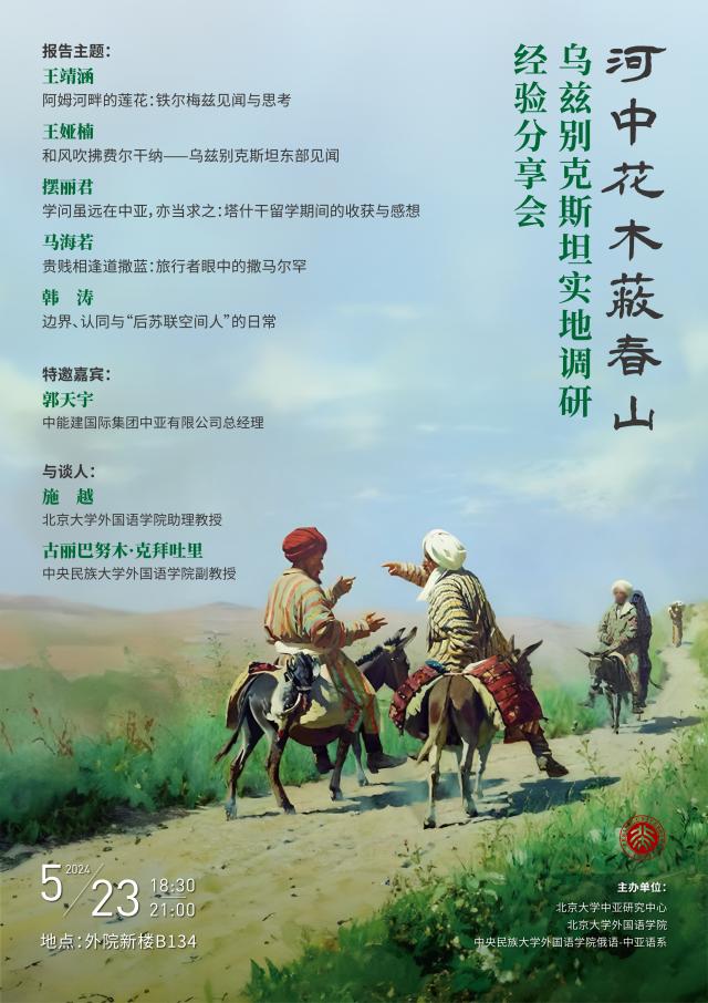 2024年5月23日晚,由北京大学中亚研究中心、爱体育网页版、中央民族大学爱体育(中国)俄语—中亚语系主办的“河中花木蔽春山:乌兹别克斯坦实地调研经验分享会”在北京大学外院新楼B134会议室顺利举办。中央民族大学爱体育(中国)副教授古丽巴努木·克拜吐里、爱体育网页版国别和区域研究专业助理教授施越出席,来自北京大学、中央民族大学的同学就乌兹别克斯坦实地调研经验进行了报告分享,会议特邀中能建国际集团中亚有限公司总经理郭天宇一同交流讨论。