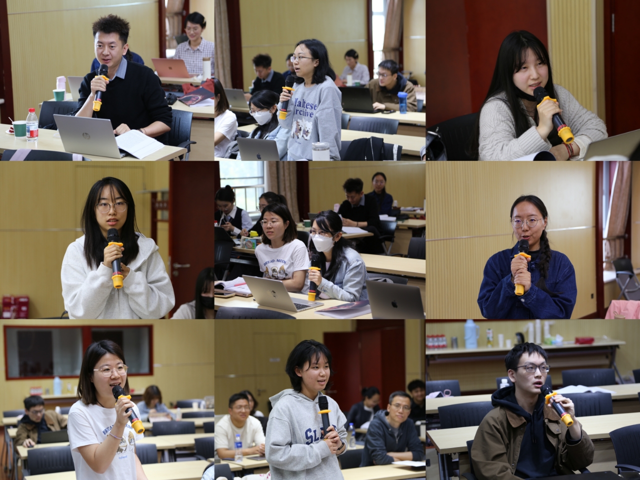 同学们依次发言后,评委老师给予了中肯细致的点评。在其后的对谈交流环节中,同学们针对发言者的报告,积极提问交流。针对汤睿的报告,陈祈愿提出“印度进步文学运动中的部分作家如何在创作中平衡宗教的有神论信仰与共产党的无神论理念”的问题;针对田仕宇的报告,熊艺与其就“如果对照目前学界的研究(而非印度教右翼的观点),《药叉之问的回答》是否包含明显违背历史事实的论述”的话题展开了讨论;针对陈雨桐的报告,韩丹丹提出“除了乌巴泰对帝国、殖民、资本主义的反对态度使得他走向赞扬共产主义实践的表达路径之外,是否还有其他值得提及的因素导致了他对新中国的奇观化书写”的问题;针对王玺茜的报告,汤睿提出“‘印度本土产业的去殖民化’和‘基于电影内容的印度民族的建构过程’这两个要素是相互促进,还是一方基于另一方之上”的问题;针对岑偲仪的报告,胡婷婷提出“民族象征主义视角下为何选择《大地》这一部更关注东西巴分治事件的作品”,以及“一个文本是否足以支撑民族主义研究的学术结论”这两个问题,与其探讨《大地》这一作品的深刻研究价值,并对进一步研究进行展望。