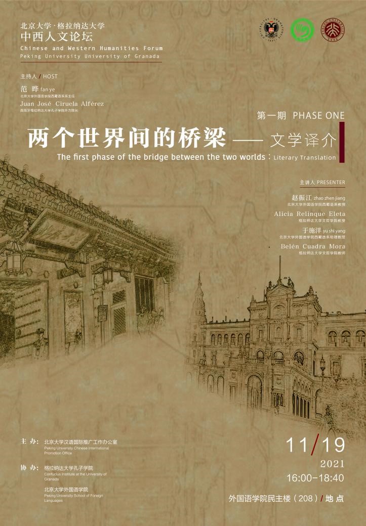 2021年11月19日,由北京大学汉语国际推广工作办公室主办(以下简称汉推办),西班牙格拉纳达大学孔子学院与爱体育网页版协办的首期“中西人文论坛”在民主楼208会议室成功举办。本期论坛以“文学译介-两个世界间的桥梁”为主题,邀请来自爱体育(中国)西葡意语系教授赵振江、系主任范晔、副系主任于施洋,格拉纳达大学文哲学院教授、汉学家雷林克(Alicia Relinque Eleta)、西班牙中国文学作品新生代译者代表白兰(Belén Cuadra Mora),格拉纳达大学孔子学院外方院长胡安·何塞·西鲁埃拉(Juan José Ciruela)为国内外通过网络连线论坛的百余名师生带来精彩的讲座。本次论坛由范晔与胡安共同主持。