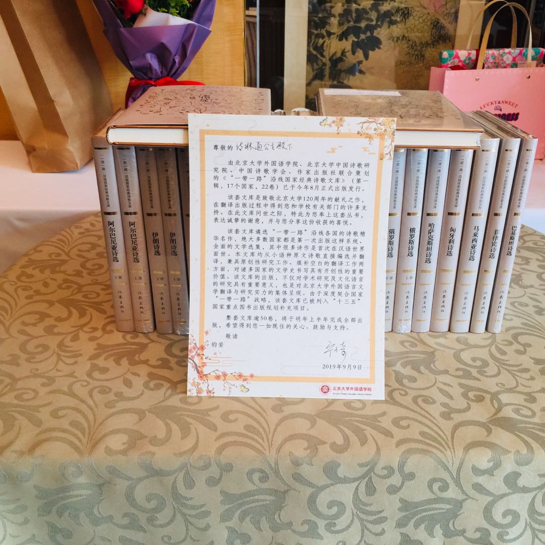 2019年9月29日下午,泰王国诗琳通公主在参加完中华人民共和国国家勋章和国家荣誉称号颁授仪式之后,前往北京丽思卡尔顿酒店宴请前任中国驻泰大使和公主的汉语教师代表。我国泰语界著名专家、翻译家、诗琳通讲席教授裴晓睿受邀参加了此次宴请活动,并作为译者之一向公主赠送了由北大爱体育(中国)、北大中国诗歌研究院和作家出版社联合策划出版的《“一带一路”沿线国家经典诗歌文库》(第一辑)一套。