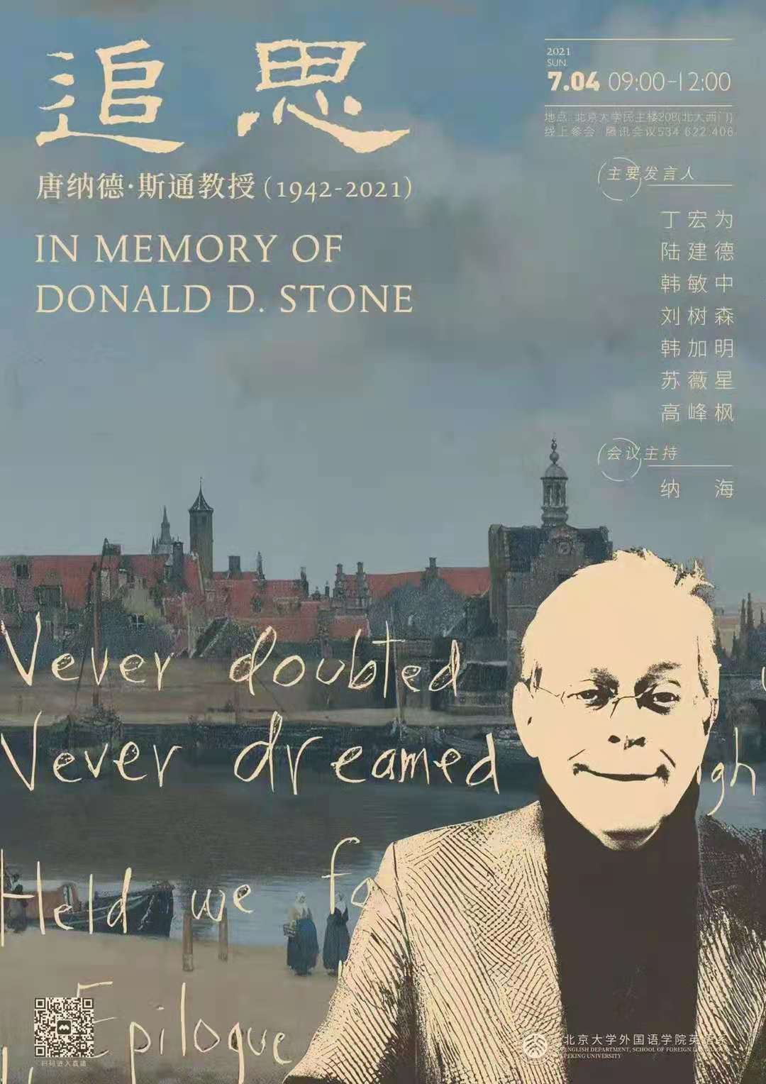 2021年7月4日上午,唐纳德•斯通教授追思会于民主楼208会议室召开。北京大学英语系高峰枫、刘意青、丁宏为、韩敏中、韩加明、刘建华 、Tom Rendall、苏薇星等多位老师及英语系各届同学,中国社会科学院陆建德,首都师范大学杜维平和王峥教授,北京大学赛克勒考古艺术博物馆副馆长曹宏等在线下参会,另有一百余人通过腾讯会议线上参会,共寄哀思。本次追思会由英语系纳海老师主持,邀请斯通老师的亲人及中国朋友们依次发言,分享与斯通老师有关的回忆和故事。