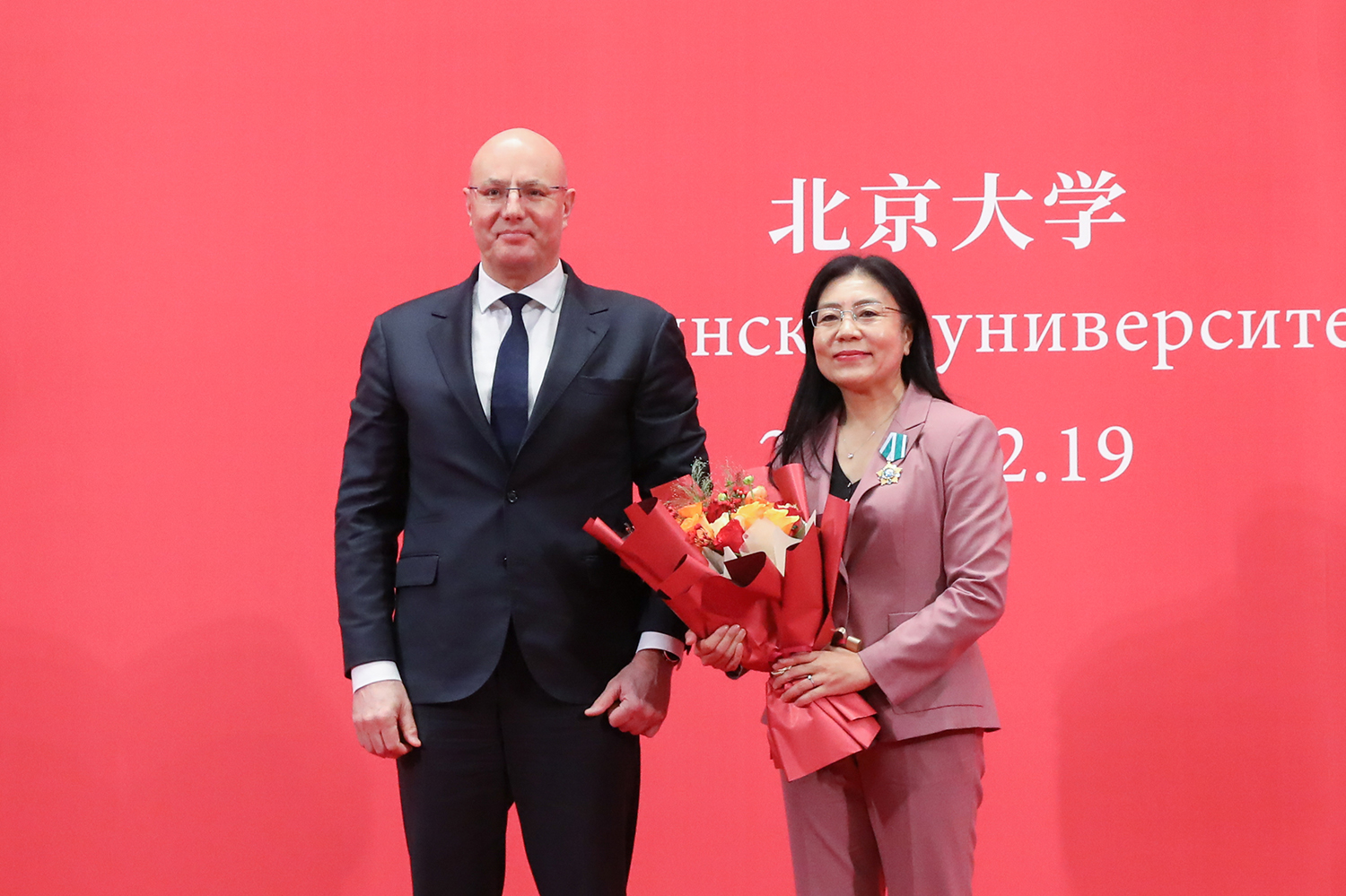会见结束后,切尔内申科出席宁琦俄罗斯联邦“友谊勋章”颁授仪式。张锦主持仪式并致辞,他介绍了北京大学与俄罗斯各领域的合作情况,以及宁琦在俄语教学科研、人才培养和中俄文化交流方面作出的贡献。切尔内申科在致辞中指出,俄中两国关系具有战略意义,已达到了前所未有的高水平。他感谢宁琦以及北京大学和中国俄语教学研究会对普及俄语、促进文化交流等所作的积极努力。切尔内申科宣读了第870号俄罗斯联邦总统令,授予宁琦俄罗斯联邦“友谊勋章”,“以表彰其为在中华人民共和国俄语普及和俄罗斯文化推广方面作出的巨大贡献”。宁琦接受勋章,并在致辞中表示,勋章凝结着中俄两国人民彼此尊重、友好交往的深厚情谊,获颁勋章不仅是对她个人的充分肯定,也是对中国高校俄语界和北京大学积极推进中俄高等教育人文交流和两国文化教育事业发展的鼓励。未来,她将带领同事们一如既往地发挥桥梁和纽带作用,为国家培养可堪大任的俄语人才,推动中俄民心相通,推动中俄人文交流与合作迈向新的更高的台阶。