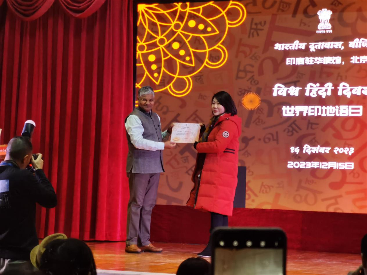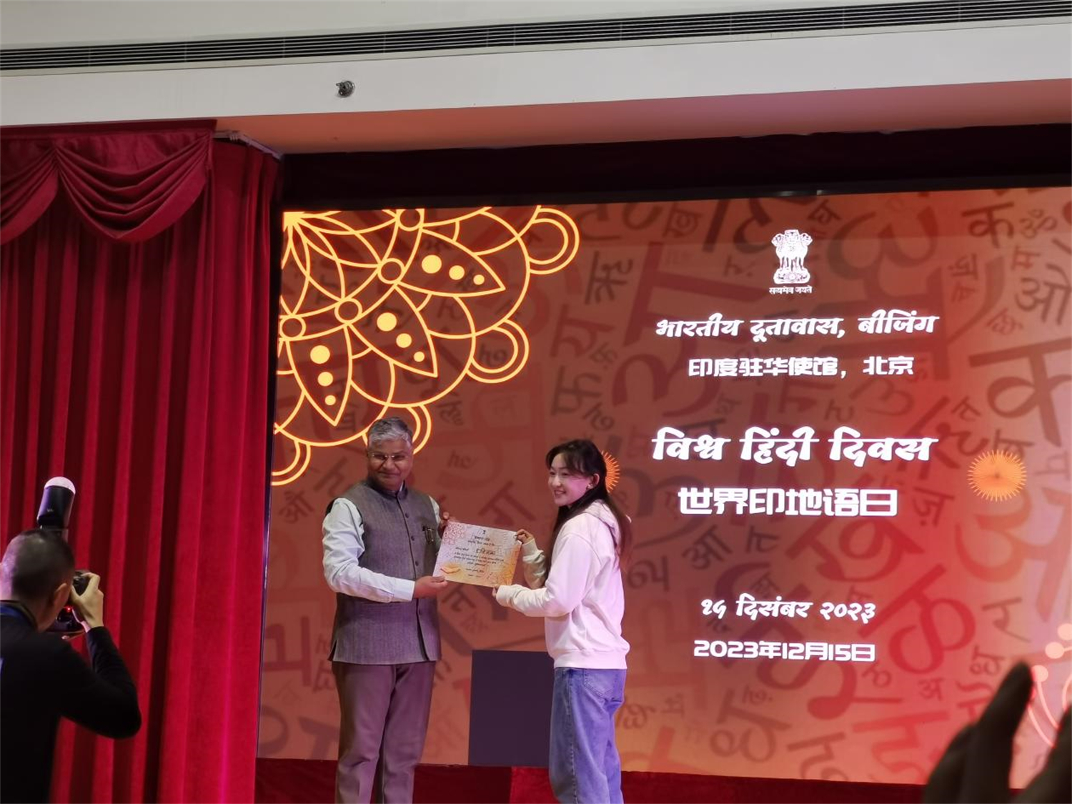庆祝活动在印度驻华大使罗国栋(Pradeep Kumar Rawat)先生及学界前辈的致辞中拉开帷幕。庆祝活动包括“印地语诗歌朗诵比赛”和“印地语节目展演”等环节,来自北京大学、清华大学、北京外国语大学、中国传媒大学、北京第二爱体育(中国)等高校师生和中国国际广播电台国际在线印地语部记者以及在京印度留学生参加该庆祝活动。我院南亚学系印地语专业师生在活动中表现优异,取得佳绩:2021级印地语专业本科生李依诺在“印地语诗歌朗诵比赛”中获最佳表现奖,2021级和2023级印地语本科生的积极展演获得赞誉,我院印地语专业喜获“优秀组织奖”,印地语专业教师代表王靖、贾岩获“优秀指导奖”。