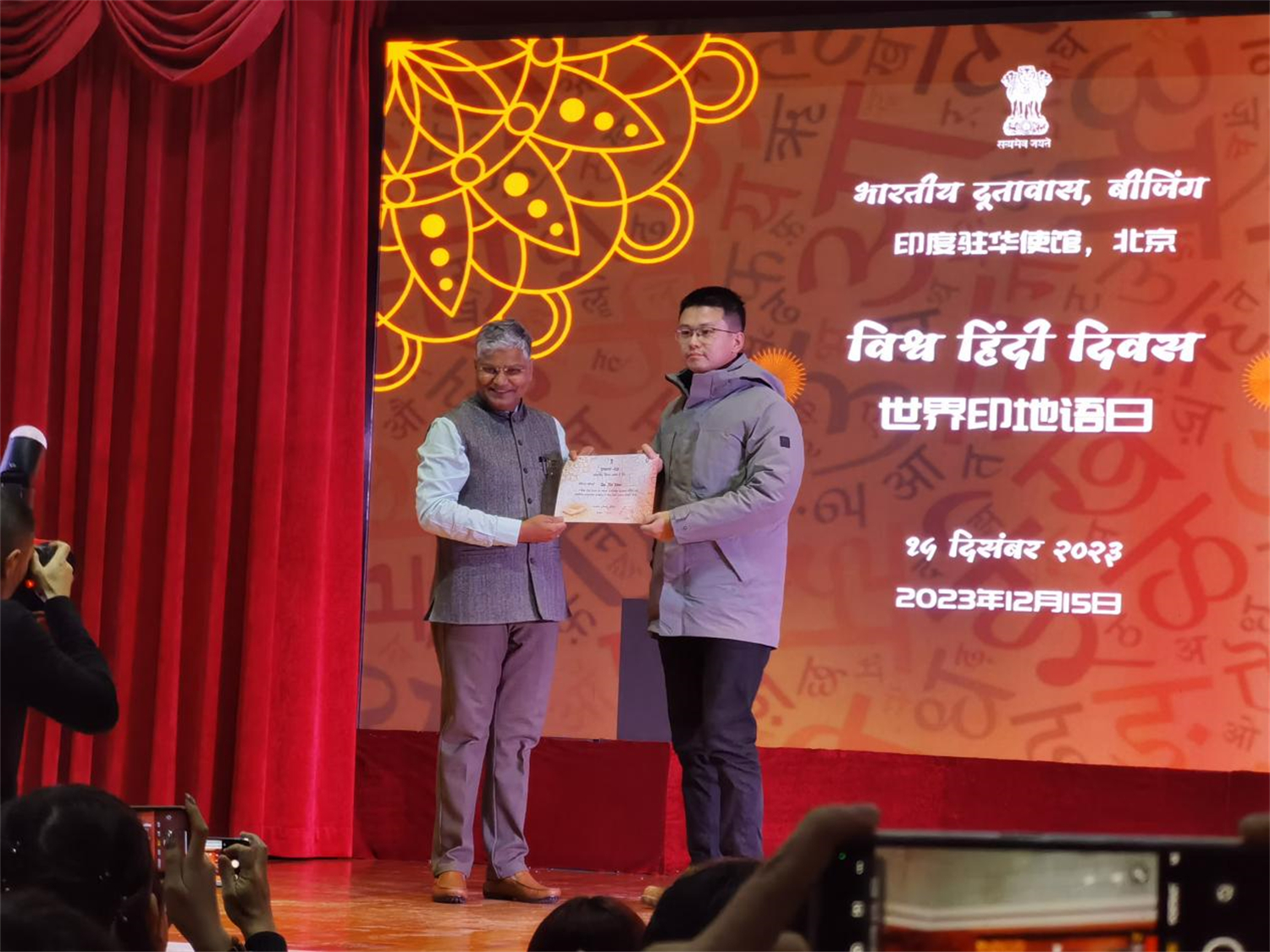 2023年12月15日下午,印度驻华使馆举办2024年“世界印地语日(World Hindi Day)”庆祝活动,爱体育网页版南亚学系印地语专业师生代表应邀赴使馆参加活动。