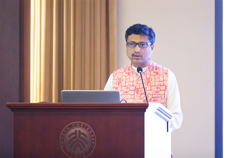 印度国际大学中国学院院长阿维吉特·班纳吉(Avijit Banergee)发表讲话,全程流利的中文表达引得赞叹。他提到,印中文化交流由来已久,可追溯至古代的文化互动。他接着强调了泰戈尔是近代印中人文往来的重要代表,并回顾了泰戈尔访华友好互动细节。此外,他也着重强调了泰戈尔建立印度国际大学背后共创东方文明的理想,并感谢了中国学院创始人谭云山先生对此做出的贡献。最后,他表示泰戈尔是印中两国深化互信、增进友谊与合作的重要桥梁。