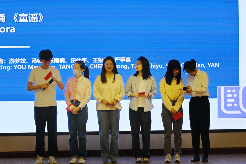 随后北京大学南亚学系研究生孟加拉语课程的同学们表演了孟加拉语集体朗诵《童谣》和泰戈尔歌曲吉他弹唱《如果无人理会你的呼唤》。