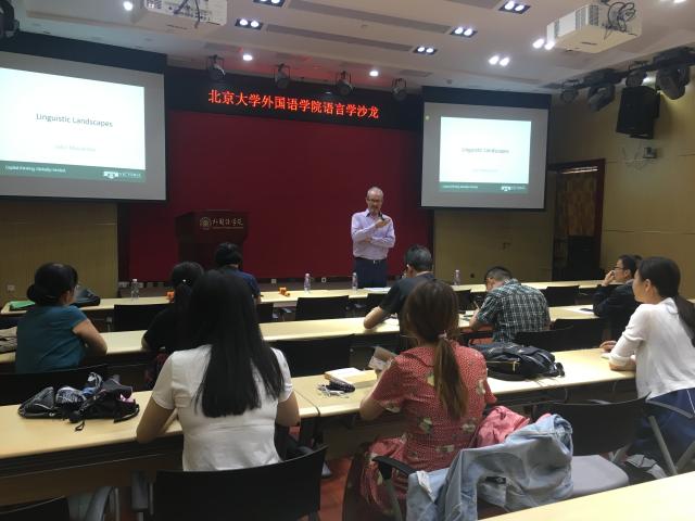 在第二场讲座“语言景观”中,Macalister教授介绍了“语言景观”这一社会语言学的重要论题。他指出,语言景观指的是“语言和文化的视觉呈现”,从更广泛的视野来看,人们身边任何承载了信息的事物都可以纳入语言景观的研究范围。Macalister教授首先从传统的对标识语言的研究入手,介绍了语言景观的传统研究方法,包括定义研究空间、标识语言计数、对是否为官方标识进行判定,对多语标识中不同语言的重要性和对应性上进行分析,最后将其与当地的语言政策与语言实践进行对比。接下来,他以东帝汶语言景观研究为例进行了阐释,通过对该国某一区域不同语种标识的统计,他对当地的语言情况及其背后的政治经济因素进行了分析。之后,他又介绍了扩展版的语言景观概念,指出一切符号系统都可以归入语言景观的研究中,在研究方法上也从过去的注重量化逐渐转向了质性研究。他以新西兰的纪念碑和马来西亚的香港鞋店外的塑像为例,阐释了语言文字和图画各自的表意功能,并结合历史背景探讨雕塑所传达的意义以及场景对意义的影响。最后,Macalister教授指出,通过对语言景观的研究,我们可以更深入地理解社会生活中的语言问题。