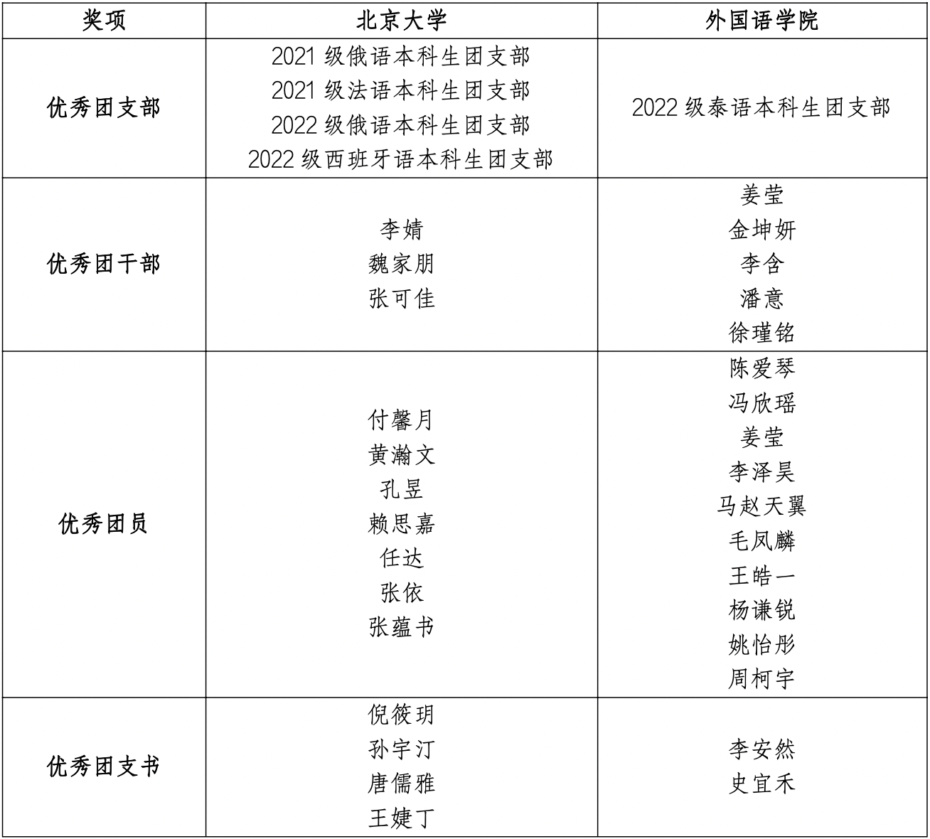 为深入开展学习贯彻习近平新时代中国特色社会主义思想主题教育,深化共青团改革,调动基层团组织的积极性、主动性和创造性,全面构建基层团组织“凝聚青年、服务大局、当好桥梁、从严治团”四维工作格局,引导广大青年坚定理想信念,扣好人生的第一粒扣子,踔厉奋发、勇毅前行,努力成为德智体美劳全面发展的社会主义建设者和接班人,争做有理想、敢担当、能吃苦、肯奋斗的新时代好青年,根据《北京大学共青团系统评优实施办法》,院团委组织开展了2022—2023学年共青团系统评优表彰工作。经基层团组织推荐和个人申报、院系审核、评选等环节,产生2022—2023学年共青团系统先进集体和先进个人等院级奖项获奖名单和校级奖项推荐名单。