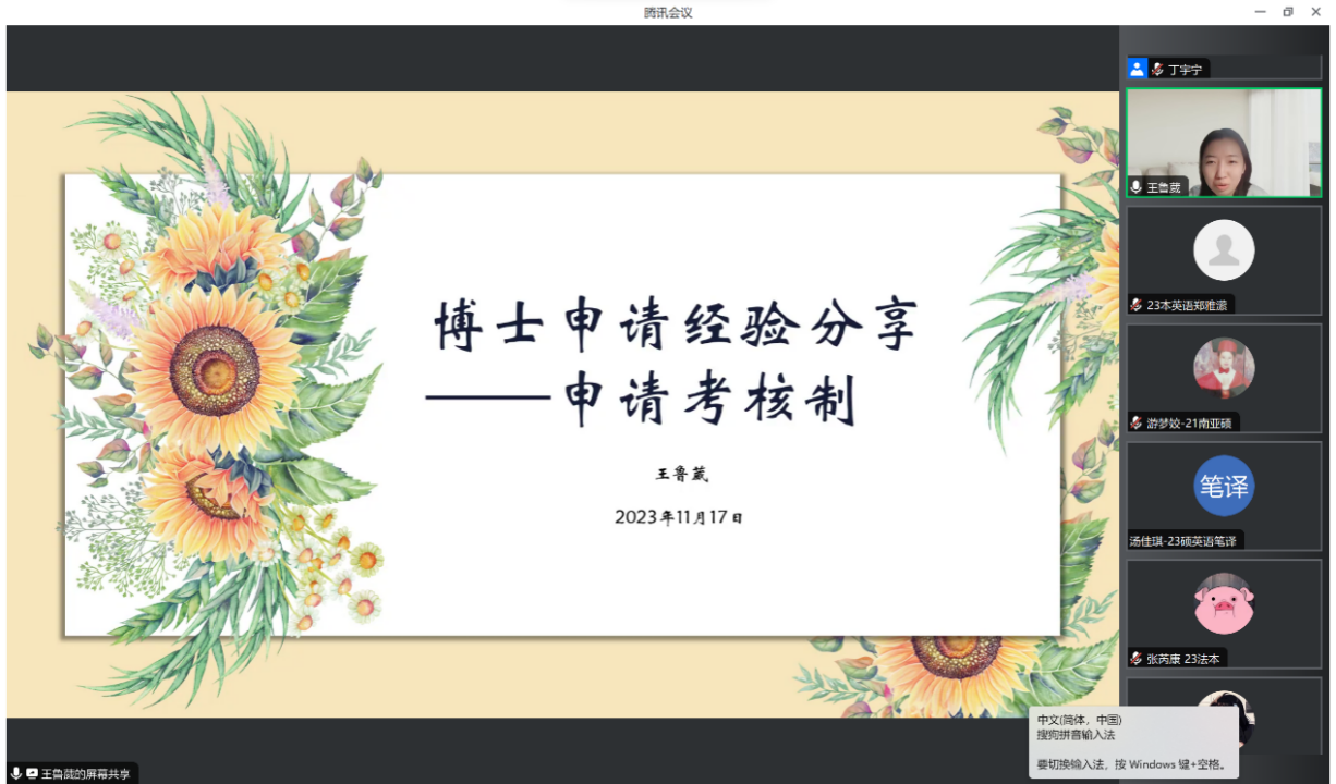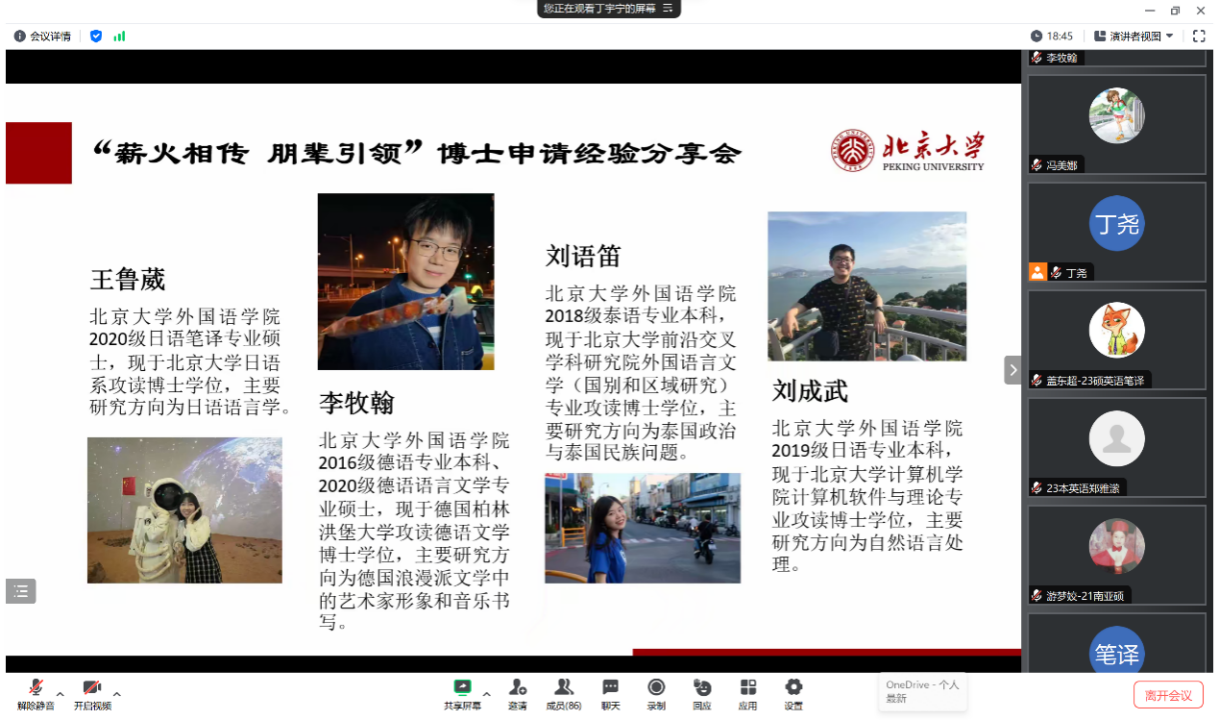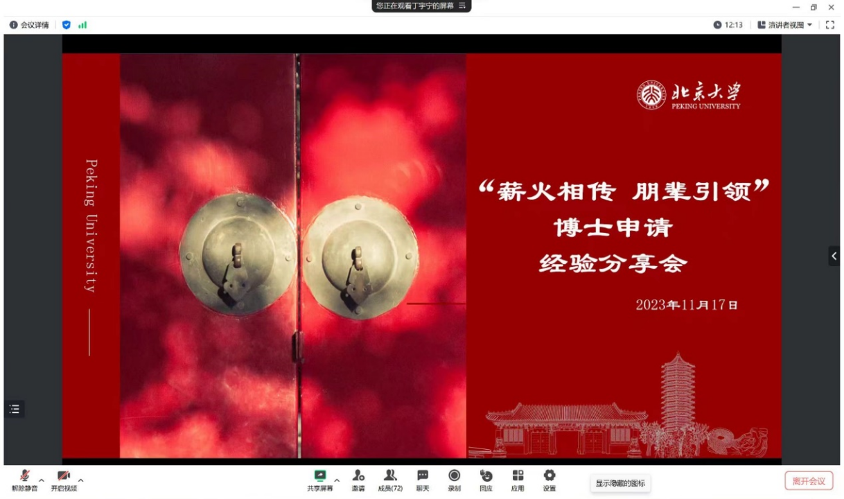 为帮助外院学子了解博士申请流程以及博士就读体验,解答有志于攻读博士学位的同学所关切的问题,爱体育网页版于11月17日晚举办“薪火相传,朋辈引领”博士申请经验分享会,学院党委副书记冯美娜、辅导员丁尧出席,近百名同学参与活动。