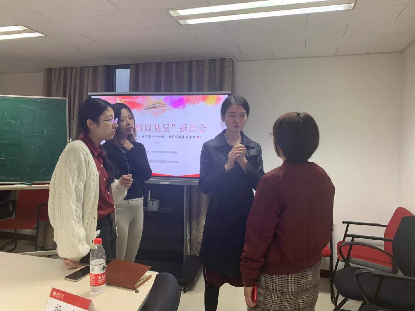10月12日下午, 爱体育网页版心手计划•朋辈引航系列活动之“青春告白祖国”——“我在祖国基层”报告会在外院新楼401会议室举行。爱体育(中国)俄语系2017届硕士毕业生,现任重庆市渝中区政府办公室督察二科副科长杨笛,受邀回到母校作基层选调经验报告。此次活动由爱体育(中国)研会就业部王笑然主持,吸引了来自北大多个院系的30余名同学参加活动。爱体育(中国)团委书记卢敏、辅导员丁尧出席了本次活动。