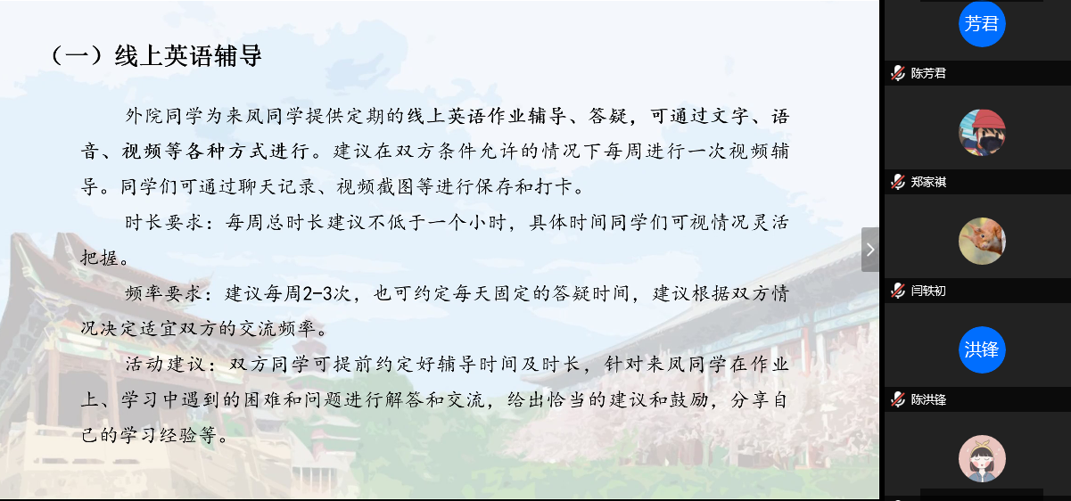 王恒分享了外院的基本情况和防疫工作概况。通过播放外院20周年院庆视频,王恒介绍了北大外院的发展历程和基本情况。此次疫情中,外院各党团支部共开展近200次党团日活动,集体学习习近平总书记的两次回信精神,并开展了专题讲座、“同桌计划”、线上K歌大赛等文体活动,陪伴同学们的居家生活;外院学子还积极投身防疫的志愿服务,通过借助专业翻译防疫物资、无偿献血等方式为抗击疫情做贡献。王恒希望外院同学和来凤同学同心协力、攻克时艰,互相陪伴,一起成长。