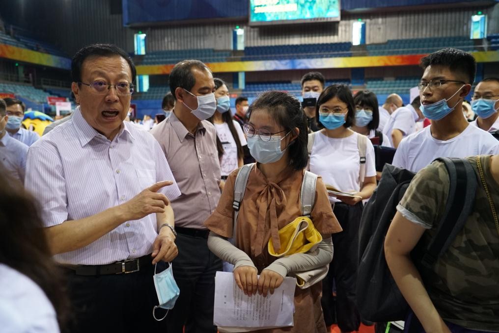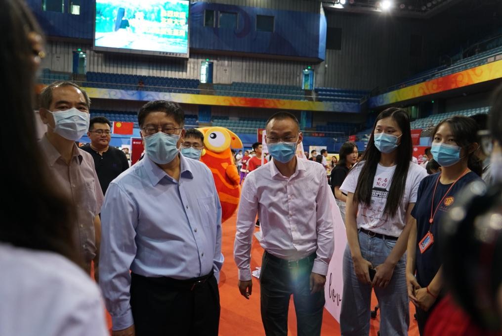 邱水平书记在迎新展台前与师生亲切交谈