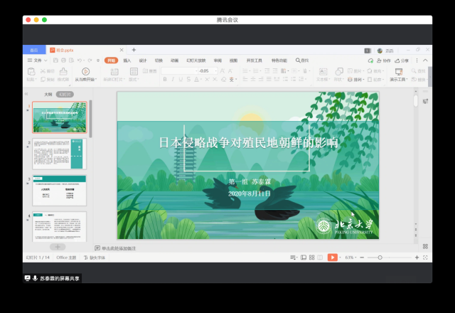 8月11日下午,课程团队开展了“铭记中韩两国抗战记忆,感知中韩视角下的爱国精神”主题活动。围绕中韩两国的抗战记忆,各组同学分享了学习与研究的成果。刘畅同学从背景、过程、影响详细梳理了壬辰倭乱的历史,深入分析了壬辰倭乱作为日本对朝鲜发起的第一次大型重要战争,是如何改变了东亚格局,并间接推进了二十世纪日本发起对朝中的侵略战争。苏泰霖同学结合自己的专业对象国和中国共有的历史背景,介绍了日本侵略战争对殖民地朝鲜的影响。高茜曼、张雅文两位同学,通过对音乐、文学、电影等文化载体的研究,阐述其所记载的抗战记忆,弘扬爱国精神。刘竹君同学展示的主题是“《开罗宣言》——中韩两国的共同抗战历程”,她谈到,我们关注事件一般是从自身的立场出发,所以以前学习《开罗会议》也仅仅关注了战后如何处置日本的问题,这次换一个视角才知道这份宣言中还包括了中国支持朝鲜独立的内容。了解了这段中朝两国人民共同抗战、互相尊重主权的历史后,她对于中韩两国人民紧密联系的认识又更深入了一层。