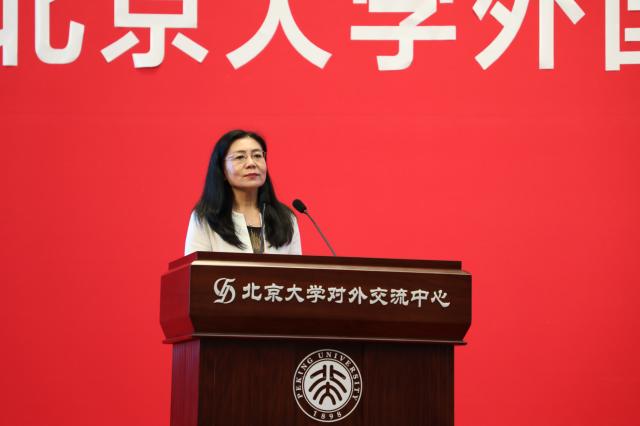 在热烈的掌声中,院长宁琦为2020级新生送上开学寄语。宁老师首先代表学院全体师生员工祝贺并欢迎新同学成为北大外院的一份子。随后,她结合当下新冠疫情的影响与国际格局变动,指出日常生活中被人们一直忽略的不确定性才是个体生命的常态。在急剧变化着的、充满不确定性的世界中,人们更需要找到自己安身立命的位置。