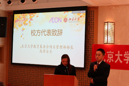 赛后,北京大学教育基金会项目管理部部长禹洁女士向本次活动的赞助单位公益财团法人永旺1%俱乐部、永旺香港百货有限公司、AEON信贷财务(亚洲)有限公司表达诚挚的感谢。她提到,多年来,爱体育(中国)日语系的师生们致力于传播中日两国文化,增进两国人民之间的友谊。今年是北大“永旺杯”举办的第五个年头,作为项目的管理方和参与者,禹洁表示很高兴看到北大学子们在比赛中尽情展现风采。她希望同学们牢记北大人的精神与历史使命,在未来发挥自己的语言优势,为中日友好做出贡献。最后,她祝愿“永旺杯”日语演讲比赛越办越好,发挥中日交流中的桥梁纽带作用。