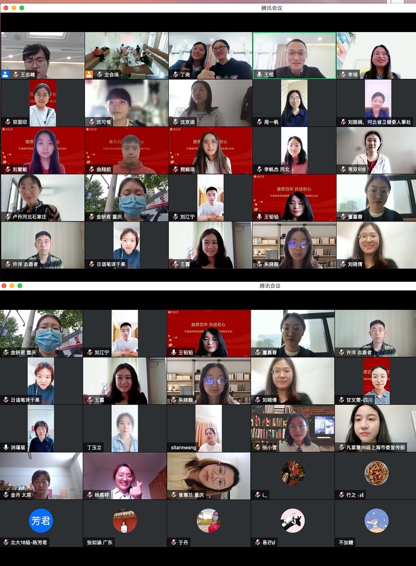 论坛到此已经接近尾声了,大家仍有诉说不尽的满腔心事与壮志。随后与会成员一起打开了麦克风和视频,合唱了一首《燕园情》,向仍历历在目的燕园时光与外院生活致敬,告白伟大祖国,献礼党的百年华诞。