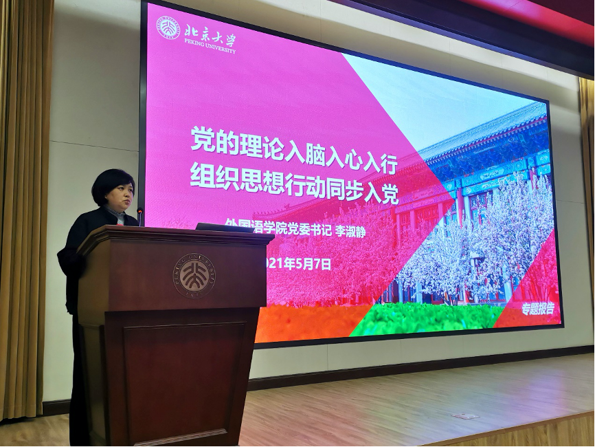 党课上,李老师与党员分享了自己在新中国成立35周年、60周年和70周年庆典上参与群众游行方阵的难忘经历。三次参加重大活动,这不仅反映了李老师在北大成长成熟的心路历程,更映照着我们党和国家在不同时期的不同的面貌、同样的初心。同时,李老师为同学们带来了我们身边的榜样故事,讲述殷洪元老师的故事,让大家看到了96岁的入党积极分子敬党爱党的赤诚之心;讲述仲跻昆先生的故事,让大家看到了老一辈党员一生的爱国之情与初心坚守;讲述外院多语种翻译团队的故事,让大家看到了新一代青年人的使命担当与责任意识。