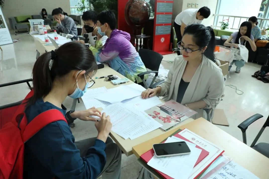 在老师和迎新志愿者的指引下,新同学们在依次完成系统报到、户口卡提交、档案材料提交等步骤之后,领取了外院为新入园的同学们精心准备的物料包,其中有学生手册、外院院衫、校园卡、绘有燕园四季景致的单页夹等物品,老师和志愿者耐心解答同学们的问题,嘱咐需要注意的事项,报到过程有条不紊地展开。