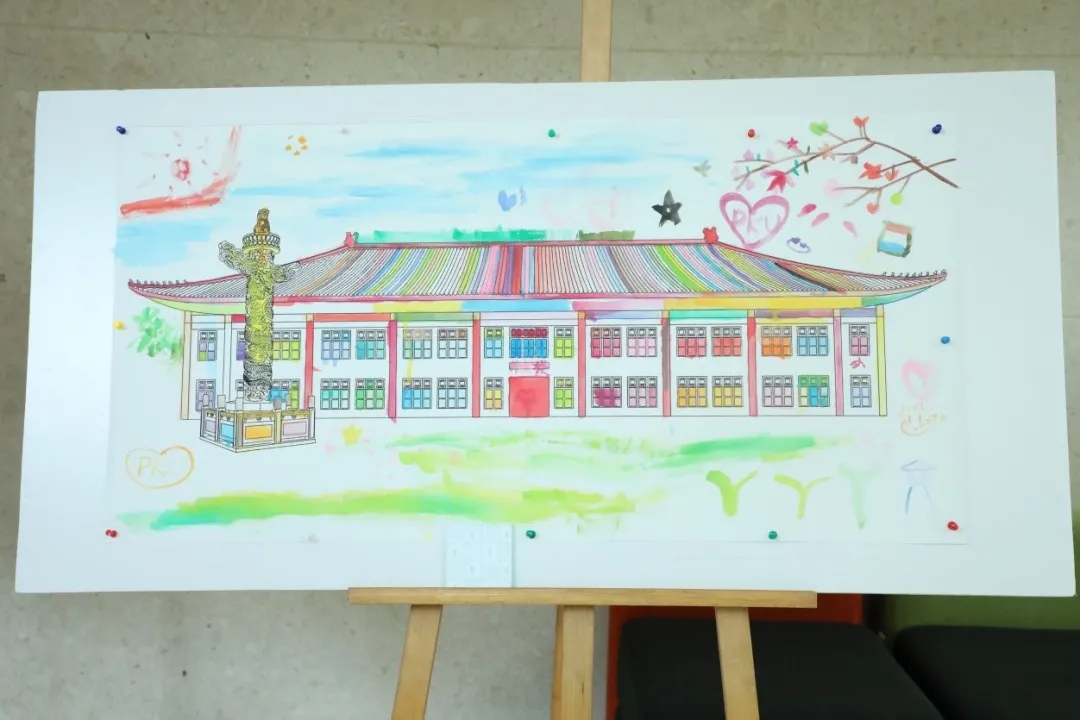 经过9月1号当天本科新生们的填图,外文楼已经有了初步色彩,研究生新生同学们继续握起画笔,在志愿者的协助下将外文楼涂抹得更绚烂多彩。蓝天白云,海棠盛放,新生们用画笔表达着对外院的浓浓情谊,这是本硕博全体新生集体送给学院的第一份礼物。